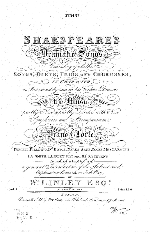 Shakspeare's Dramatic Songs, Consisting of all the Songs, Duets, Trios and Chorusses, in Character, as Introduced by him in his Various Dramas; the Music, partly New & partly Selected with New Symphonies and Accompaniments for the Piano Forte from the works of Purcell, Fielding, Drs. Boyce, Nares, Arne, Cooke, Messrs. J. Smith, I. S. Smith, T. Linley Junr. and R. I. S. Stevens, to which are prefixed a general Introduction of the Subject and Explanatory Remarks on Each Play, by Wm. Linley Esqr.