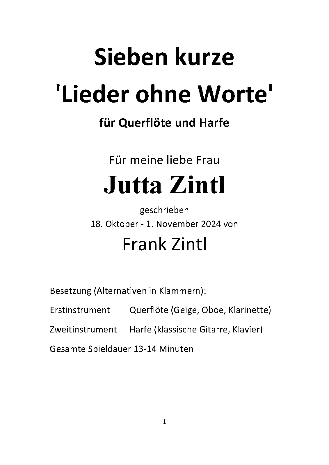 Sieben kurze 'Lieder ohne Worte' für Flöte und Harfe