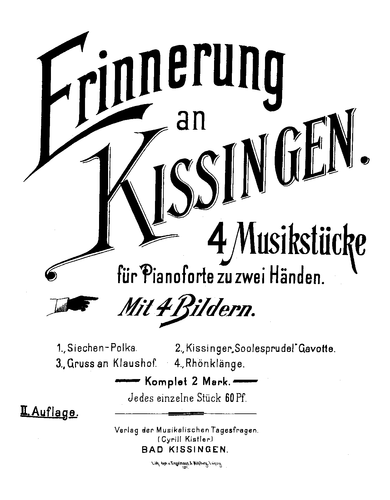 When issued by the composer in its second edition in 1891 it was included with three other works under the collective title Erinnerung an Kissingen. 4 Musikstücke für Pianoforte. (Monatsbericht (1891), p.467).