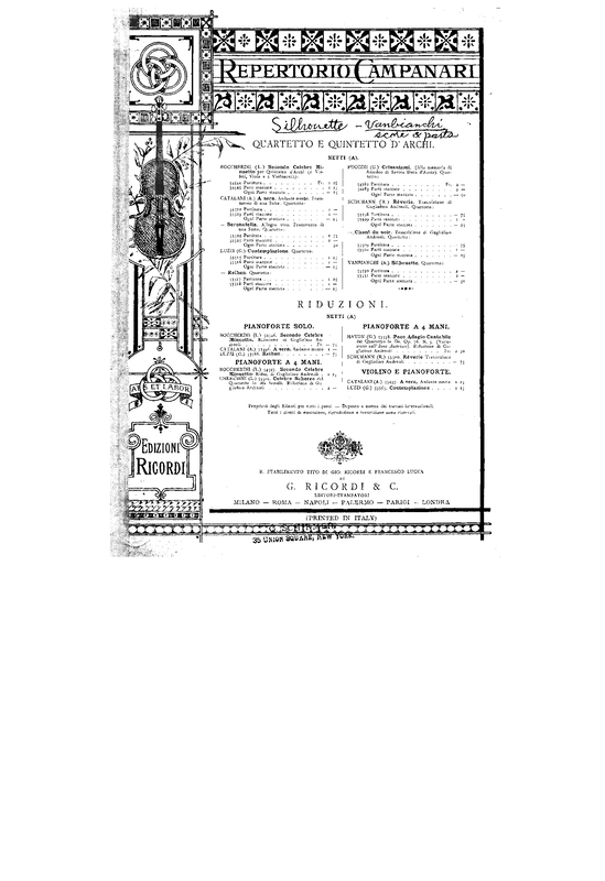 Mentioned in Il Teatro illustrato e la musica popolare: Ritratti di maestri ed artisti celebri, vedute e bozzetti di scene, disegni di teatri monumentali, costumi teatrali, ornamentazioni, ecc., ecc. , February 1889 issue, page 32, so performed (this reported on a concert, by I think Campanari's string quartet, in early 1889)- by 1889, yes. Not called Silhouette for String Quartet (on the score?), just Silhouette.