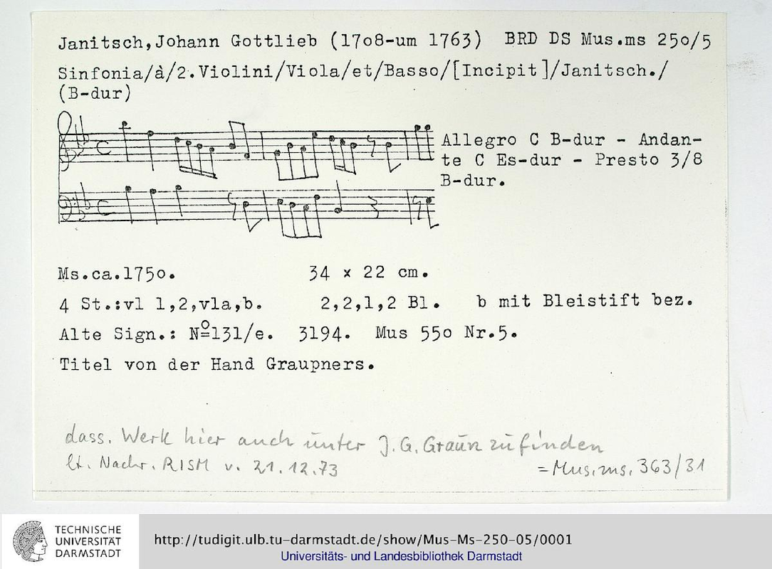 | Authorship Note This work has also been attributed to Johann Gottlieb Janitsch although most sources attribute it to either Johann Gottlieb or Karl Heinrich Graun. |
