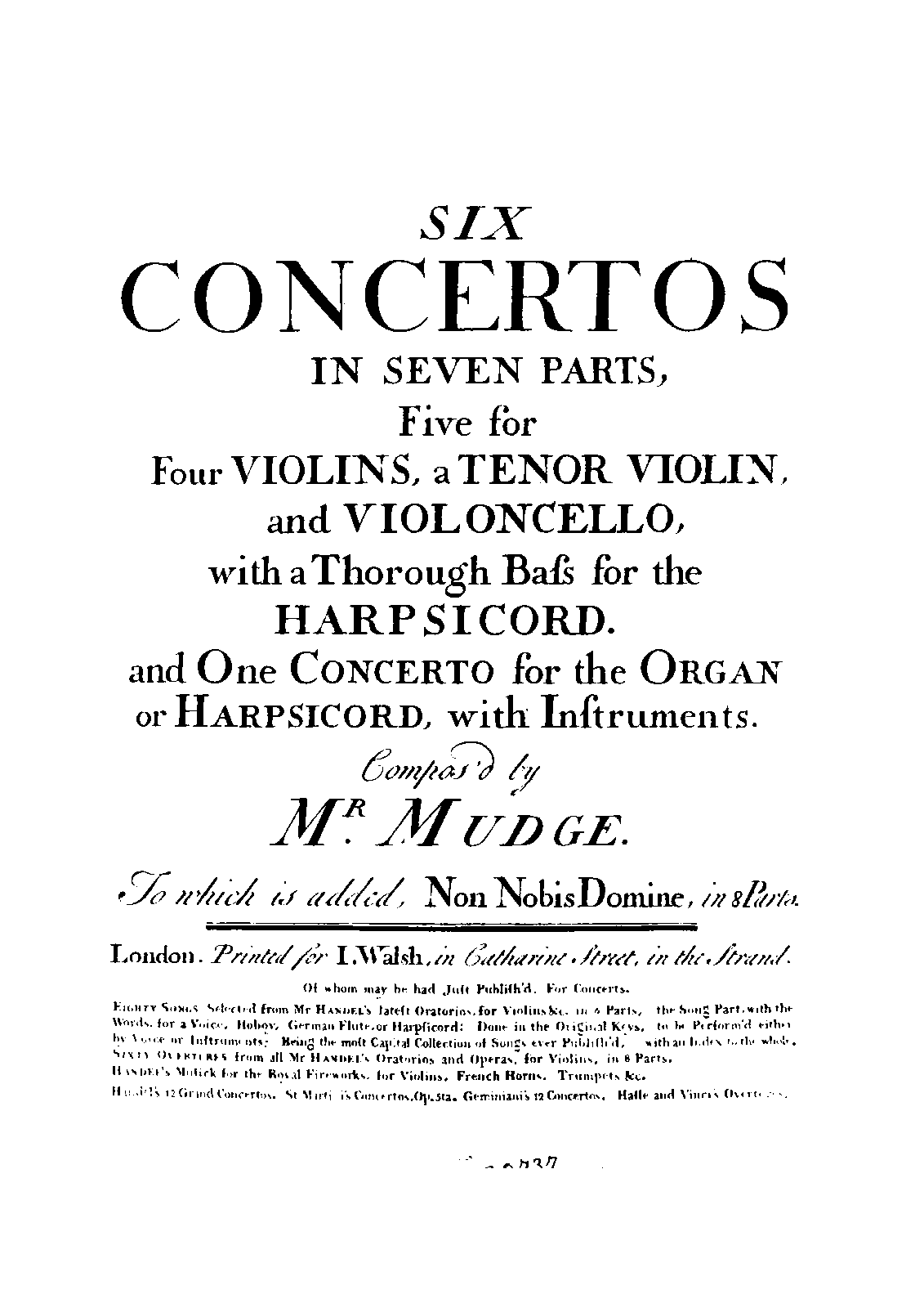 - Six concertos in seven parts, five for four violins, a tenor violin, and violoncello, with a thorough bass for the harpsicord and one concerto for the organ or harpsicord, with instruments: to which is added, Non nobis Domine, in 8 parts</span>