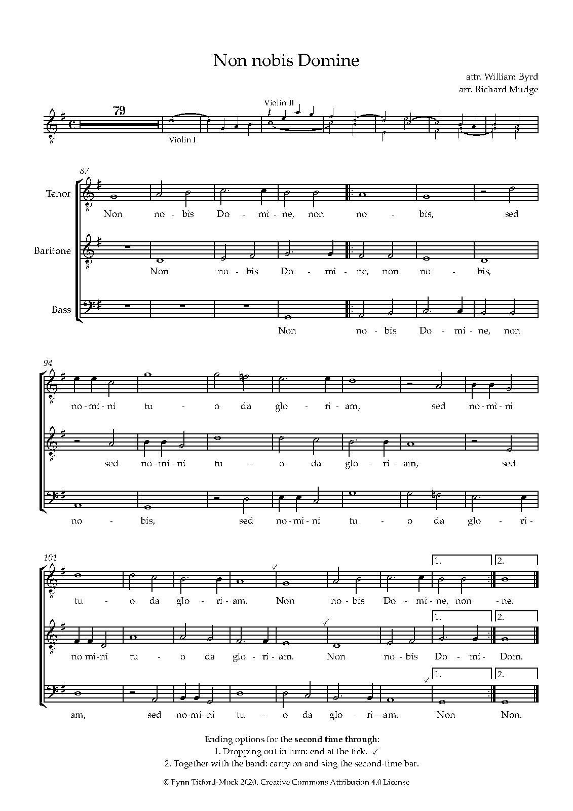 No.1: apparently for trumpet, strings, continuo (part not mentioned on title-page, nor included in the scans uploaded here) Nos.2-5: 4 violins, viola, cello, continuo No.6: organ (or harpsichord), strings, continuo Non Nobis Domine: 4 violins, 2 violas, cello, continuo + 3 vocal parts (TBarB) ad lib. for the canon - these are implied in the parts, and the starting positions marked, but the music for the sung canon itself was not originally included.