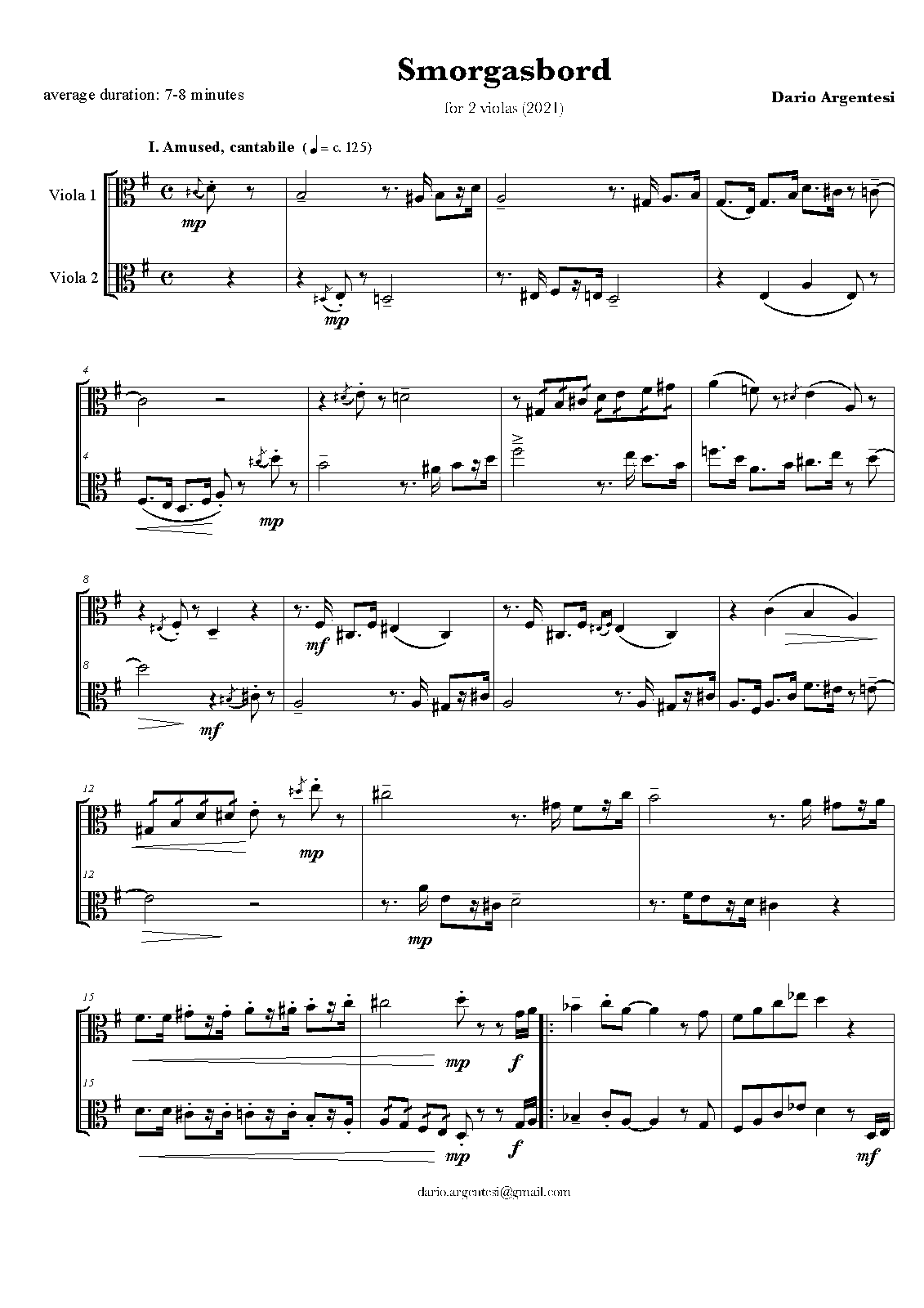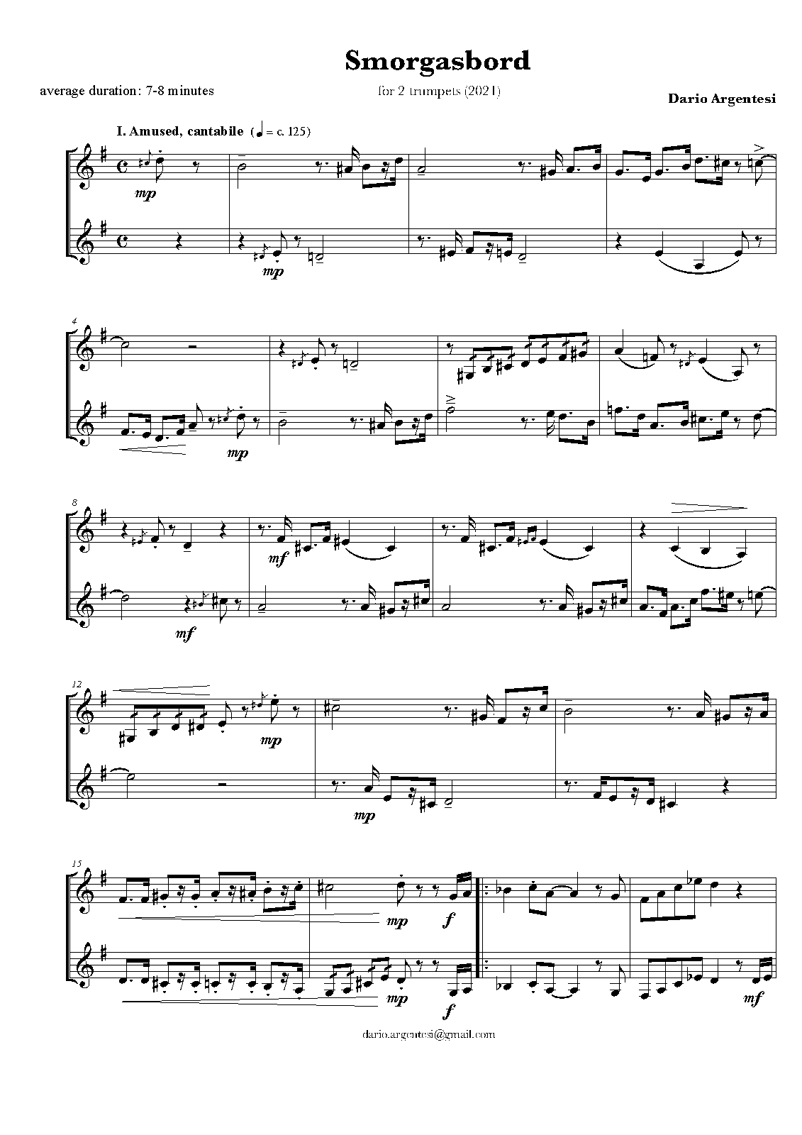 | Extra Information | Smörgåsbord is a Scandinavian buffet-style meal. The second movement is a tarantella variation of the Sultan theme from "Shahrazad". The third, Burung Kakatua, is a minor-key treatment of a popular Indonesian folksong. First and fourth are mirrored bagatelles. |