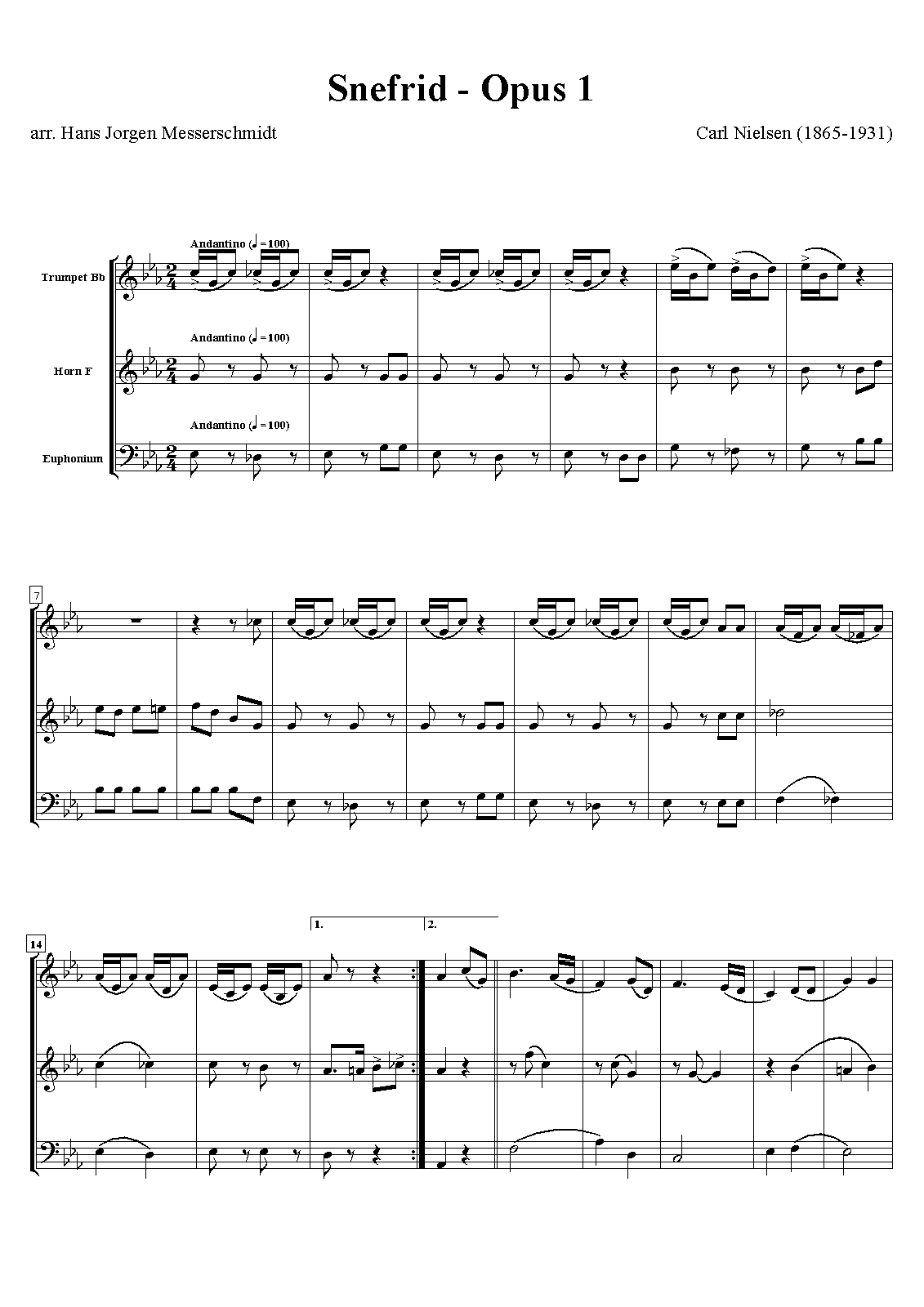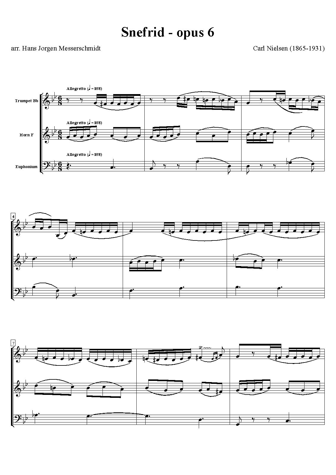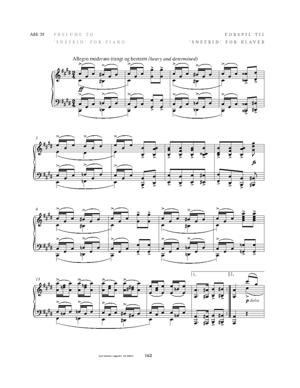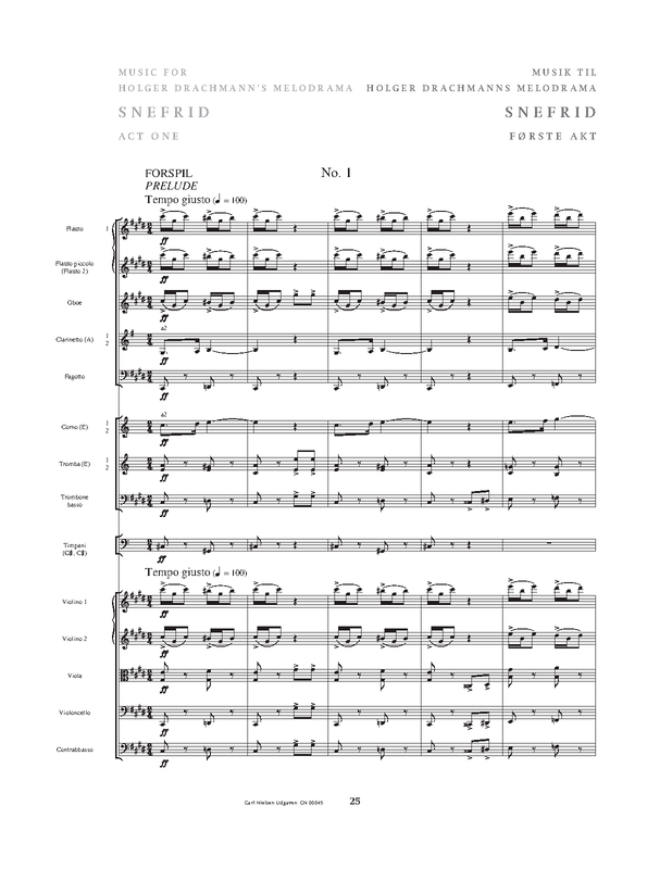 In the beginning of 1893, Carl Nielsen was requested to compose music to Holger Drachmann's play Snefrid in connection with a planned performance at Det frie Theater. In less than a month the score was finished. The plans for a production at the theatre came to nothing, however, and the music was not performed until the following year. The music was later revised and arranged by Nielsen himself. Music from no. 4 was re-used in Hr. Oluf han rider– CNW 7 (1906) and Amor og Digteren CNW 23 (1929).