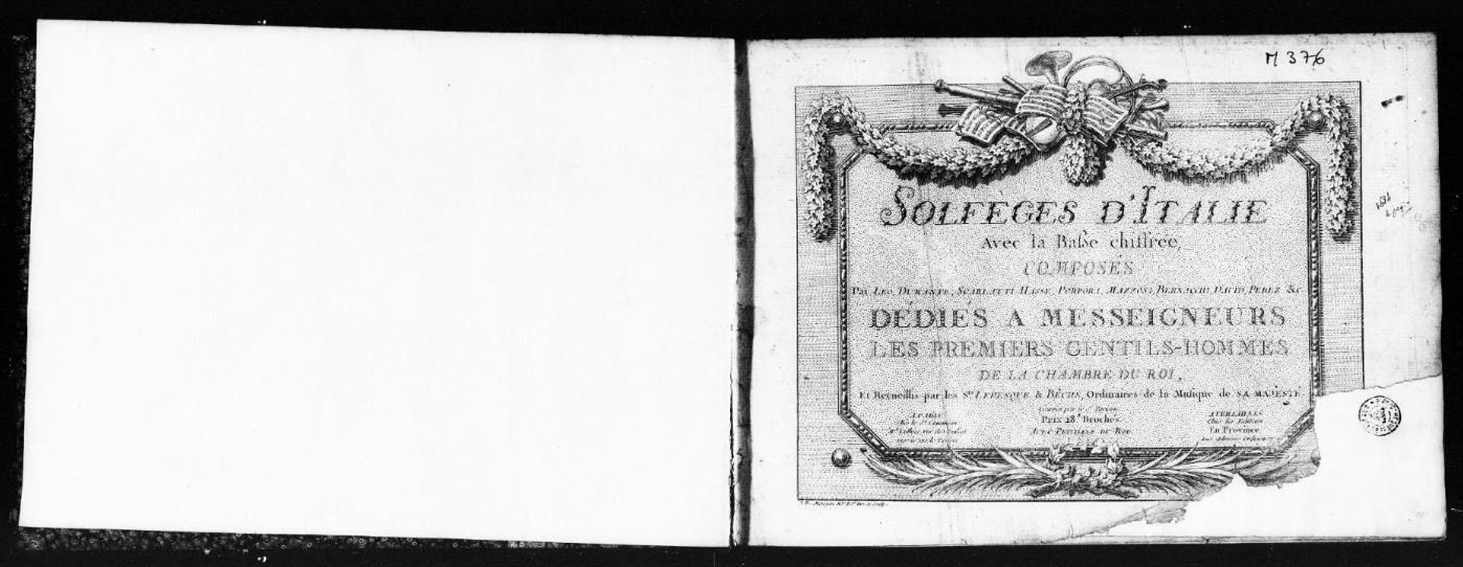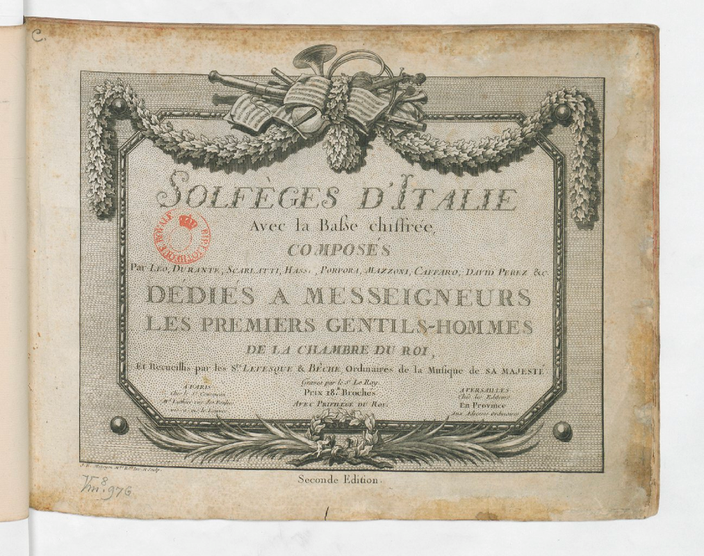 Solfèges d'Italie avec la basse chiffrée composés par Leo, Durante, Scarlatti, Hasse, Porpora, Mazzoni, Caffaro, David Perez &c., dédiés a messeigneurs les premiers gentils hommes de la chambre du Roi, et recueillis par les Srs. Levesque & Bêche, ordinaires de la musique de Sa Majesté