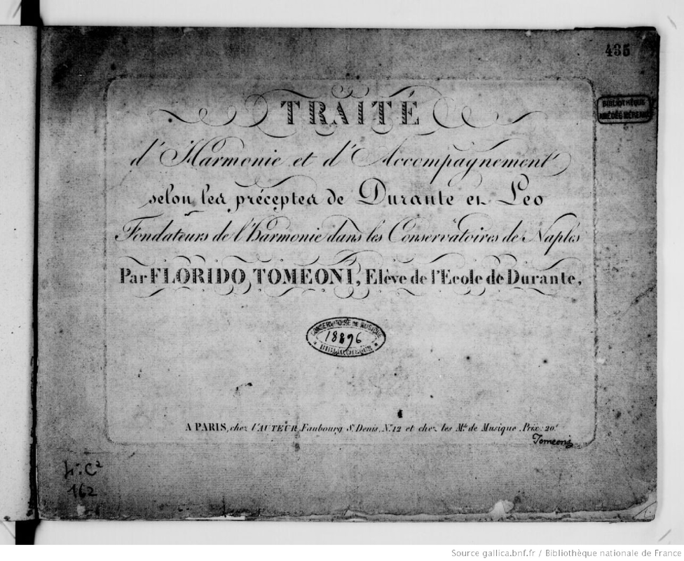 Contents identical with 3rd edtion and Pleyel edition. Title: Traité d'harmonie et d'accompagnement selon les préceptes de Durante et Leo