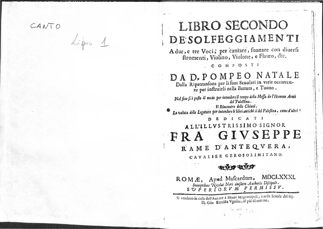- Libro secondo de'solfeggiamenti a due, e tre voci, per cantare, suonare con diversi stromenti, violino, violone, e flauto, &c. Composti da D. Pompeo Natale dalla Ripatransona per li suoi scuolari in varie occurrenze per instruirli nella battuta, e tuono. Nel fine si è posto il modo per intendere il tempo della Messa de l'Homme armé del Palestrina. Il rincontro delle chiavi. La valuta delle legature per inten-dere li libri antichi sí del Palestina, come di altri. Dedicati all'illustrissimo signor fra Giuseppe Rame d' Antequera, cavalier gerosolimitano.</span>