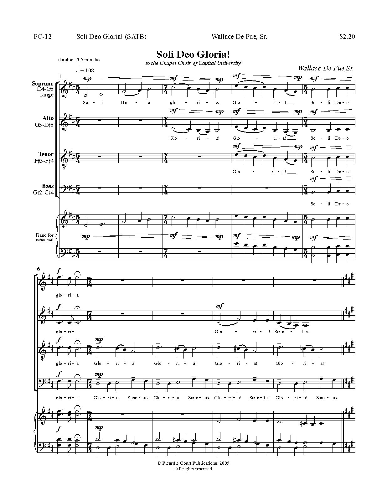 Soli Deo Gloria is a composition for the artist choir to perform. Either in concert or in church, for general, Christmas or Easter use, this work has an astounding effect. The texture is polyphonic; the musical language is contemporary; the rhythm is asymmetric. The Bowling Green State University Collegiate Chorale performed this work all over the nation; rave reviews appeared in many newspapers. The text is simply Soli Deo Gloria!