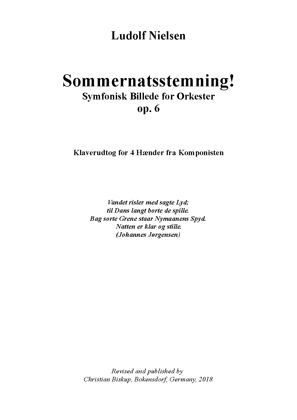 Sommernatsstemning is the 3rd orchestral work by Ludolf Nielsen, composed in summer 1903 on a poem by Johannes Jørgensen. First performed at the 1st February 1904 in Leipzig under the baton of Hans Winderstein, it received a success and was played five times until 1909. Since then, the work was not performed again. Today it seems, that the full score is lost, just a arrangement for 4-hand-piano excists and received it's first edition in February 2018.