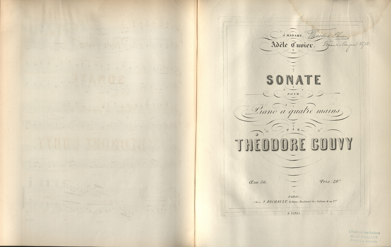 | Copyright Information | Publication noted in the Bibliographie de la France 2e série, 54e année, Nº 49, 9 Décembre 1865, p.562, r.2579.. Listed just as "Sonate pour piano à quatre mains" by this composer but the other two had not been published yet. |