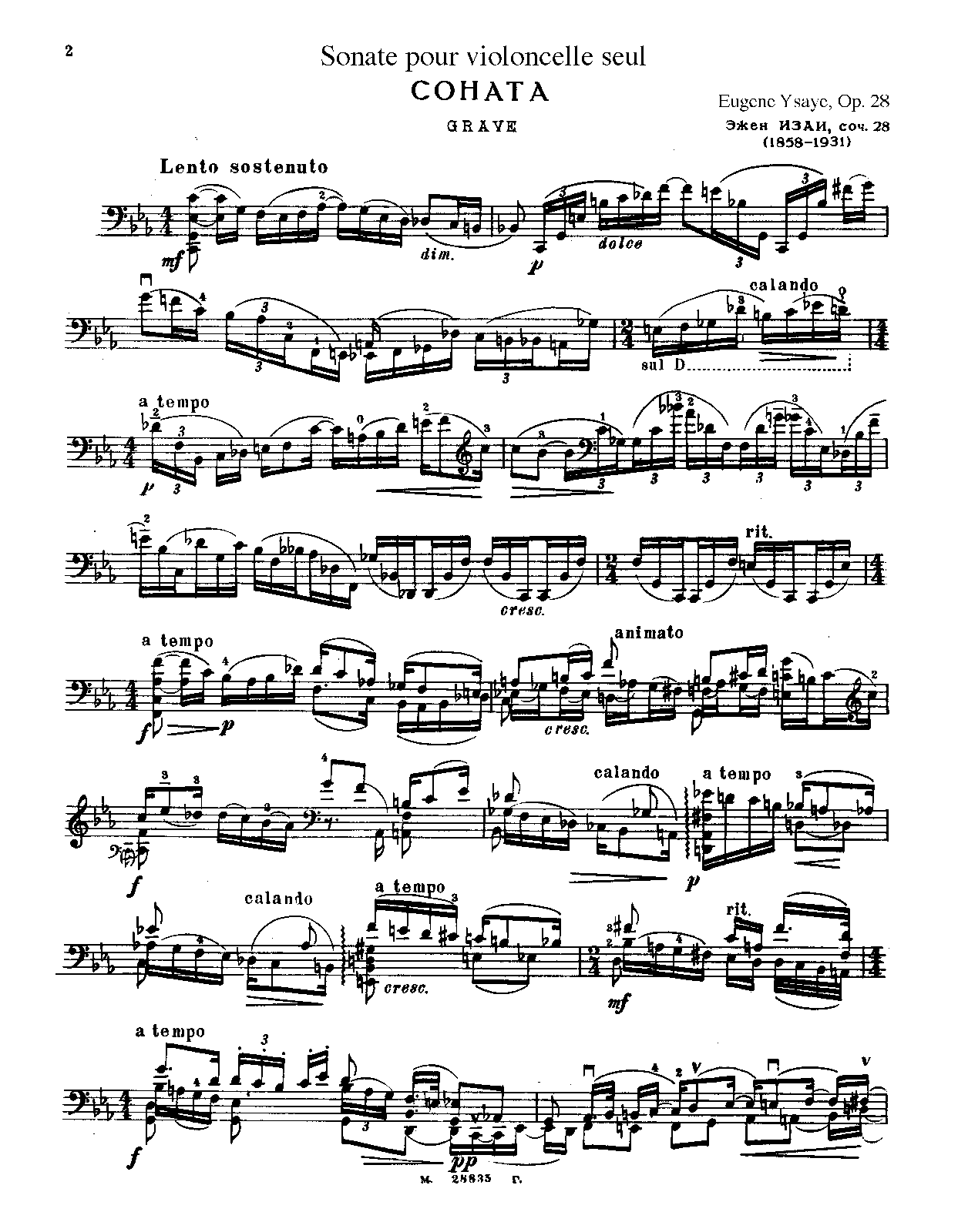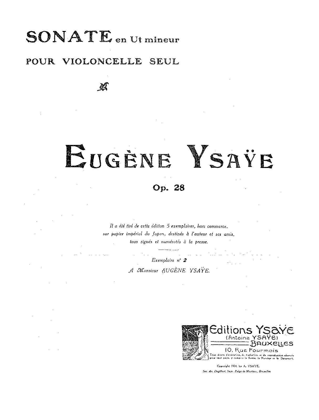 | Extra Information | This part, adressed to Ysaÿe, was the number 2 of 5 (not for sale) for him and some friends of his. A great work, it is of the same inspiration and quality than the 6 solo sonatas for violin (Ysaÿe, besides playing violin and viola, could also do something with the cello!)... It should be part of the general stock of any good cellist just like the violin sonatas are part of the violinists stock. A great work, just of the same vein as the 6 solo sonatas for violin. |