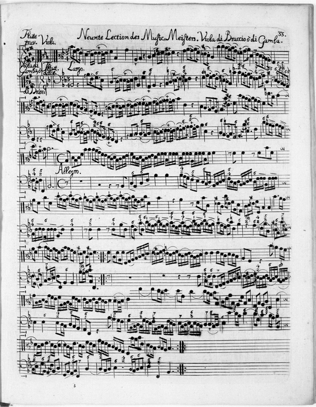 1. A major: upper staff treble clef Flute trav., lower staff alto clef Viola di Gamba, ò di Bracc.