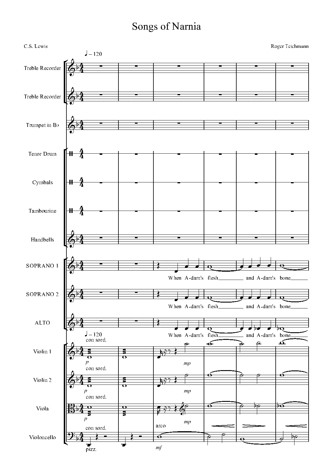 This is a musical setting of four separate verses, which can be found in two of the Narnia books: "The Magician's Nephew" and "The Lion, the Witch and the Wardrobe". The order in which they are sung is not the order in which they appear in the books, but nevertheless reflects a sort of Christian chronology implicit in Narnia - beginning with prophecy, moving through temptation and sin, and ending with the hope of spring and renewal. This was written for the local community, and is intended as community music, to involve children (both as singers and as players).