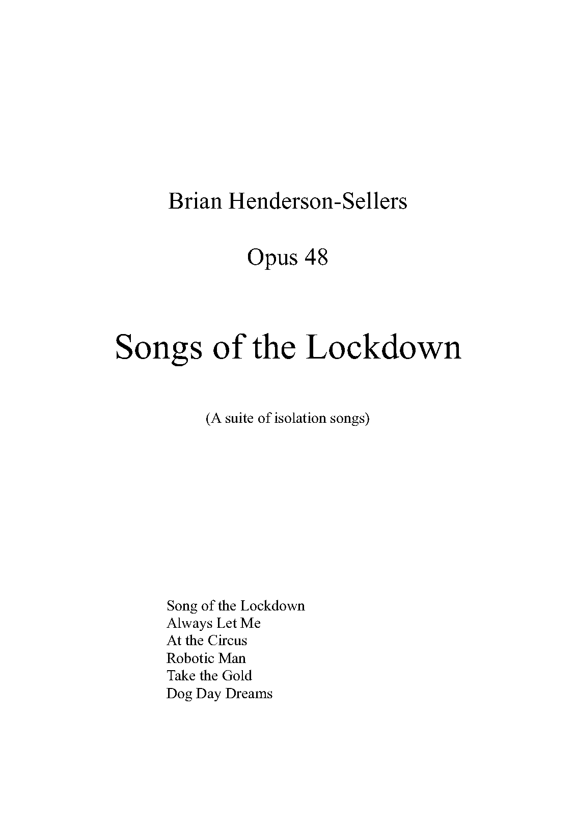 This is a suite of six songs written during the lockdown in June-July 2020. Some songs reflect upon the direct impact of Covid19 and the subsequent global lockdown; others are reflective and reminiscent of pre-Covid days.