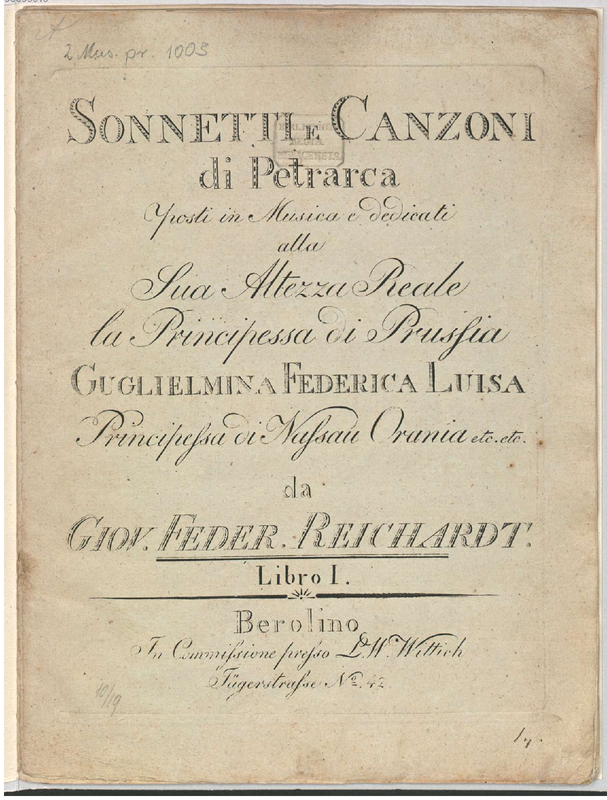 | Alternative. Title | Sonnetti e canzoni di Petrarca posti in Musica ... da Giov. Feder. Reichardt |