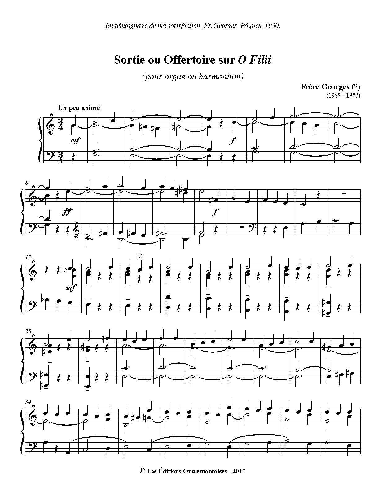 Le compositeur serait un certain Fr. Georges dont on sait rien, sinon qu'il était peut-être Belge. (Cette pièce serait parue dans Servir, revue trimestrielle de l'Association interdiocésaine francophone et germanophone des employés d'église de Belgique.)