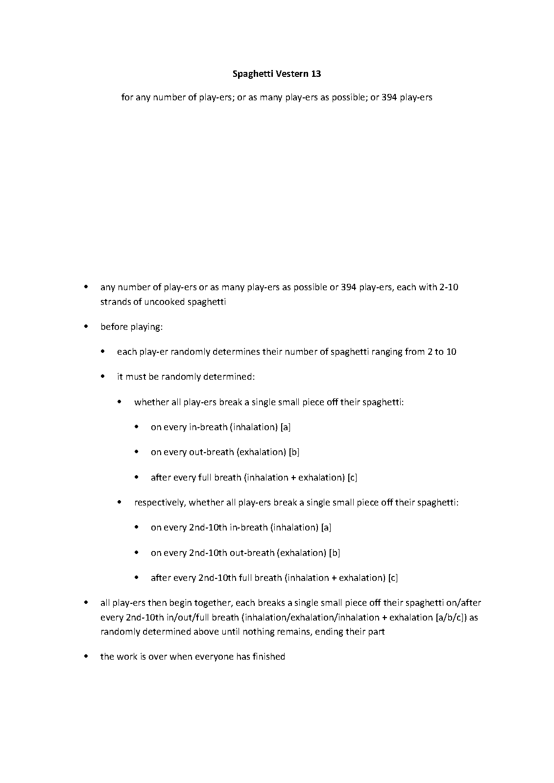 | Instrumentation | any number of play-ers or as many play-ers as possible or 394 play-ers, each with 2-10 strands of uncooked spaghetti |