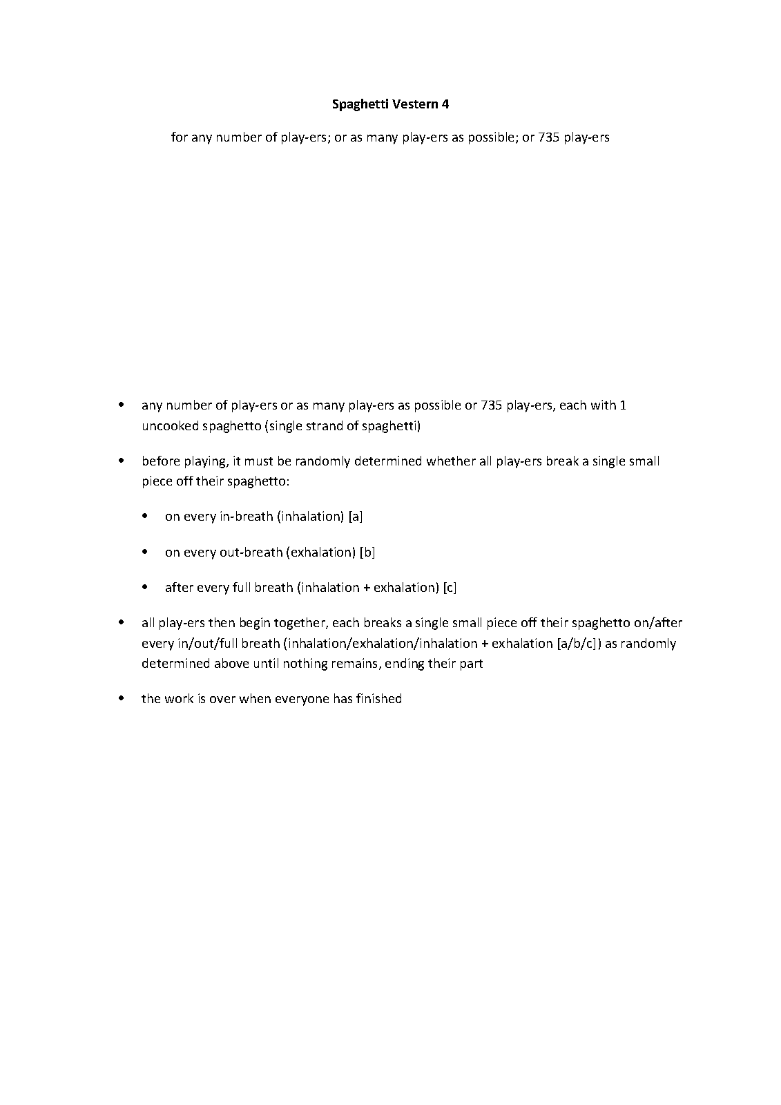 | Instrumentation | any number of play-ers or as many play-ers as possible or 735 play-ers, each with 1 uncooked spaghetto (single strand of spaghetti) |