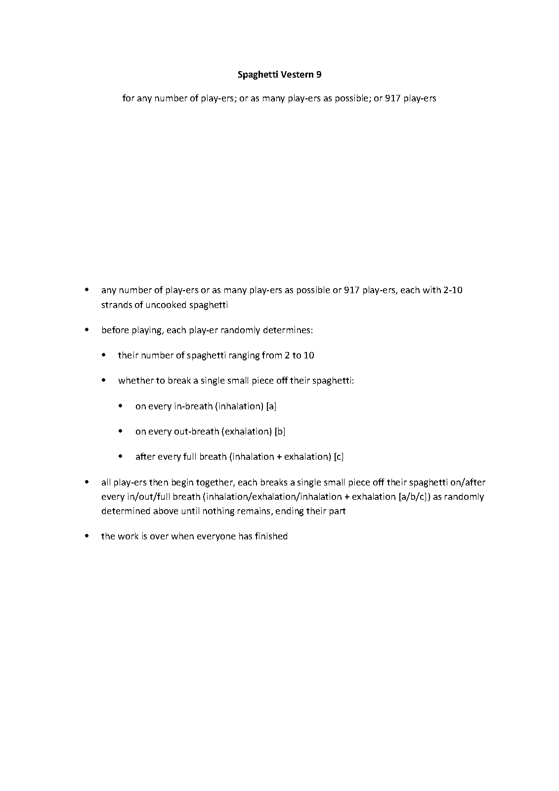 | Instrumentation | any number of play-ers or as many play-ers as possible or 917 play-ers, each with 2-10 strands of uncooked spaghetti |