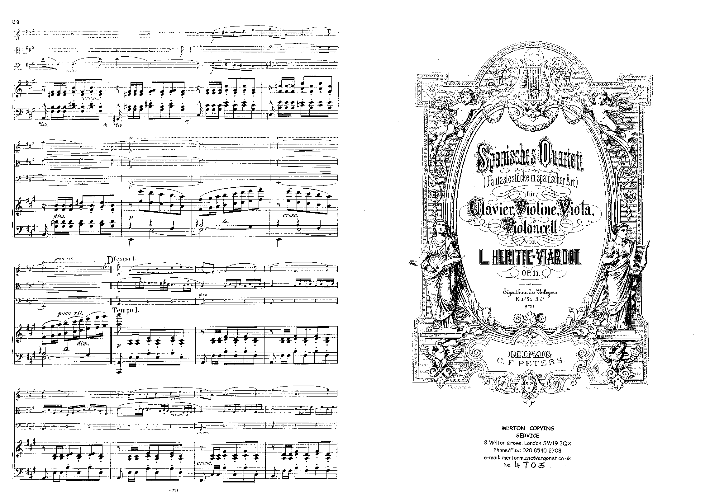 A piano quartet in D minor by Héritte-Viardot was published by E. Gérard, Paris, in 1878. (Key of the Gérard publication from Wellesley library catalog.) Perhaps this was her piano quartet Op.9 (pub. by Peters in 1883?) - Oh I see- no, it wasn't: There's a CD (Ars Produktion) of Héritte-Viardot, "Die Drei Klavierquartette": quartet in D minor ohne opus (29 minutes), quartet in A major Op.9 Im Sommer (26 minutes), quartet in D major Op.11 Spanisches Quartett (21 minutes).