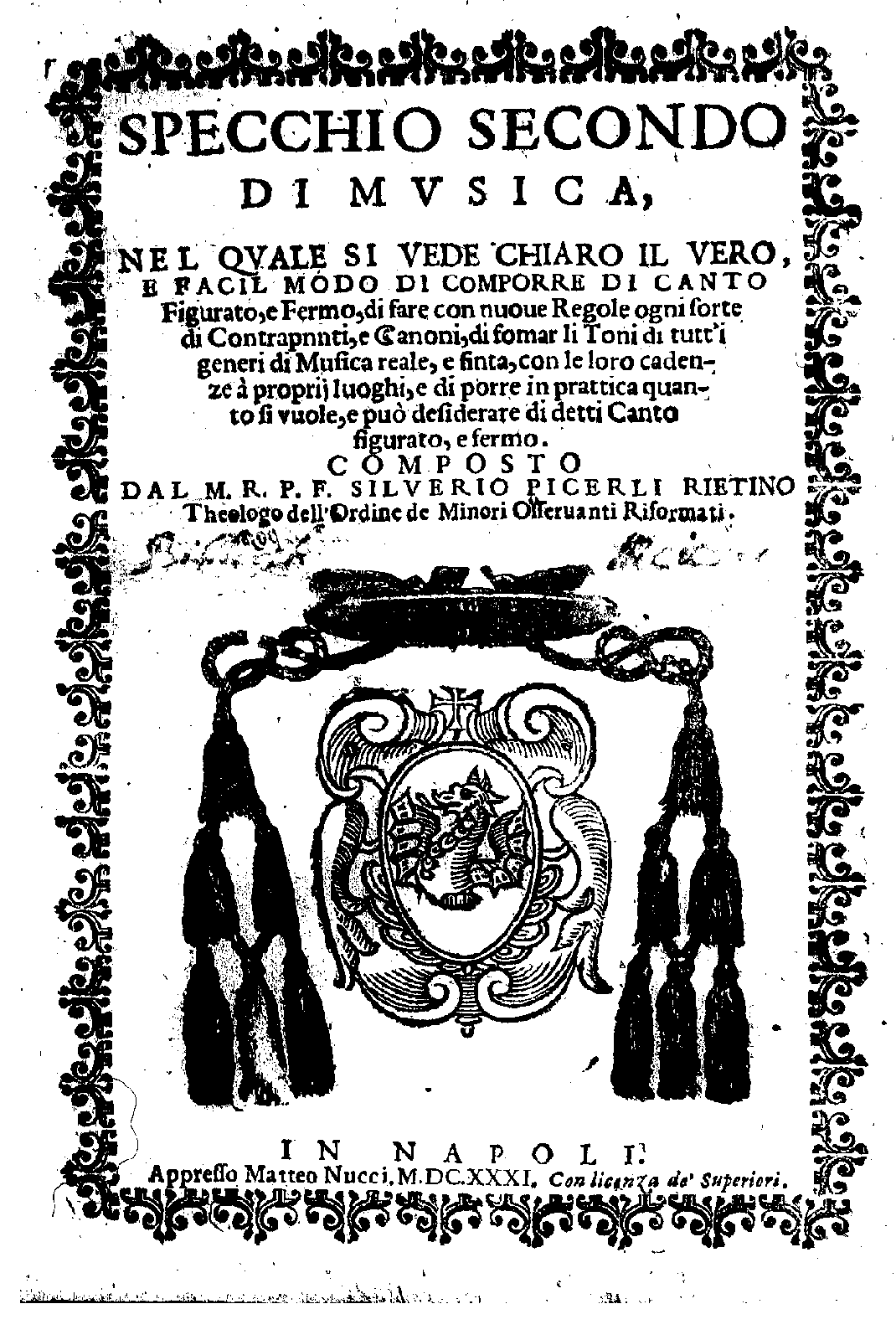 Frontispiece information: Specchio secondo di musica, nel quale si vede chiaro il vero, e facil modo di comporre di Canto Figurato, e Fermo, di fare con nuoue Regole ogni sorte di Contrapunti, e Canoni, di formar li Toni di tutt'i generi di Musica reale, e finta, con le loro cadenze à proprij luoghi e di porre in prattica quanto si vuole, e può desiderare di detti Canto figurato, e fermo.