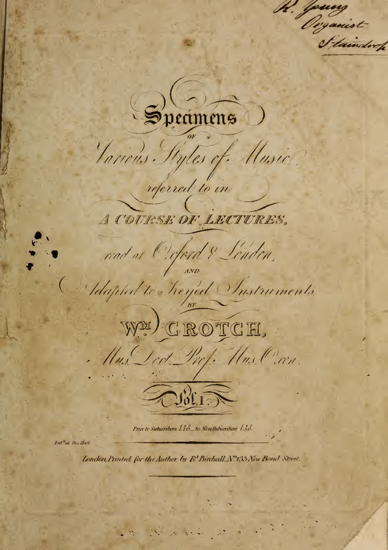 | Alternative. Title | Specimens of Various Styles of Music referred to in a Course of Lectures read at Oxford & London, and adapted to Keyed Instruments by Wm. Crotch |