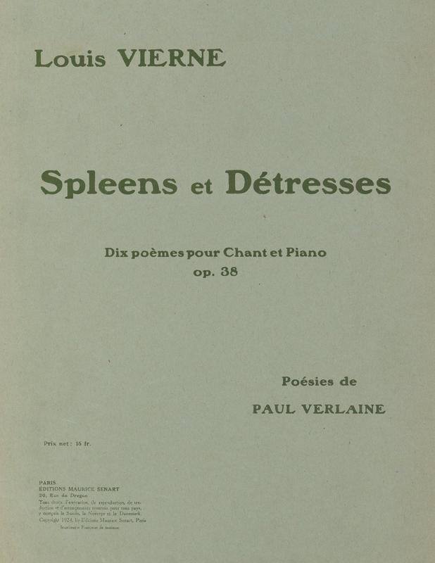 9 of the 10 exist (not no.5) orchestrated (in the hand of Madeleine Mallet-Richepin- who is said in some sources to have been Vierne's amanuensis*) in manuscript as "Spleens et détresses. 9 mélodies pour Chant et Orchestre. Poèmes de Paul Verlaine. Musique de Louis Vierne."