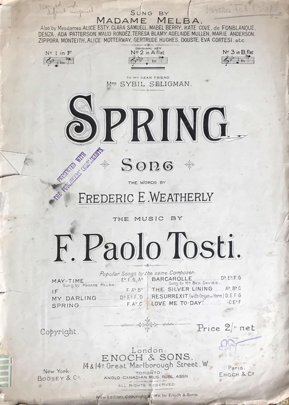 From uploader's collection. Scanned from copy once owned by Tosti's student, the British singer and composer Teresa del Riego. Her pencil annotations can be seen on the colour copy.