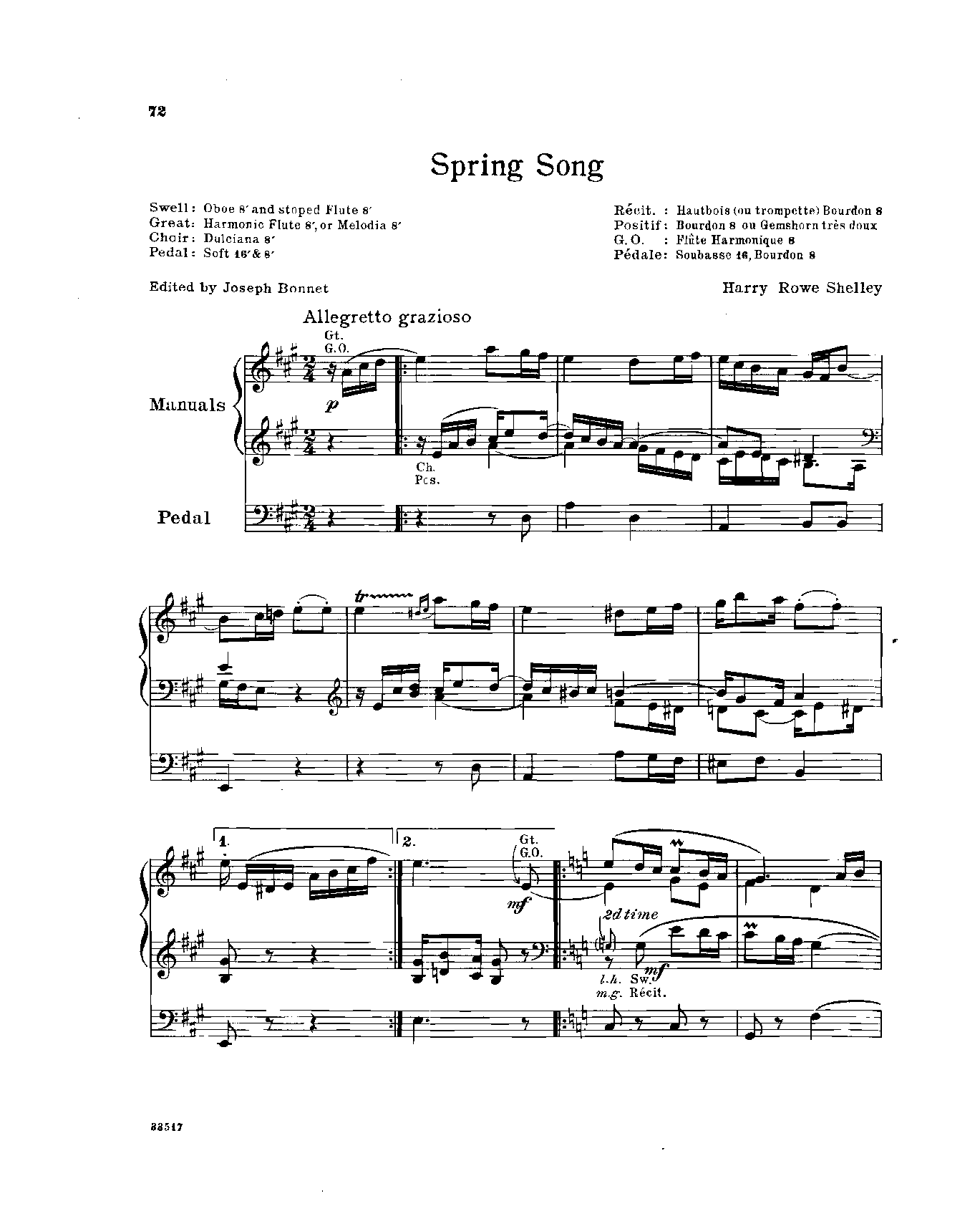 published by Schirmer in 1879 (as two pieces for the organ, Spring Song and Scherzo).