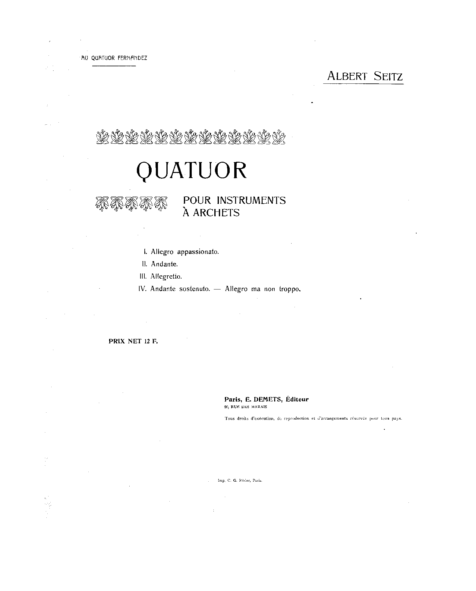 | Dedication | Au Quatuor Fernandez |