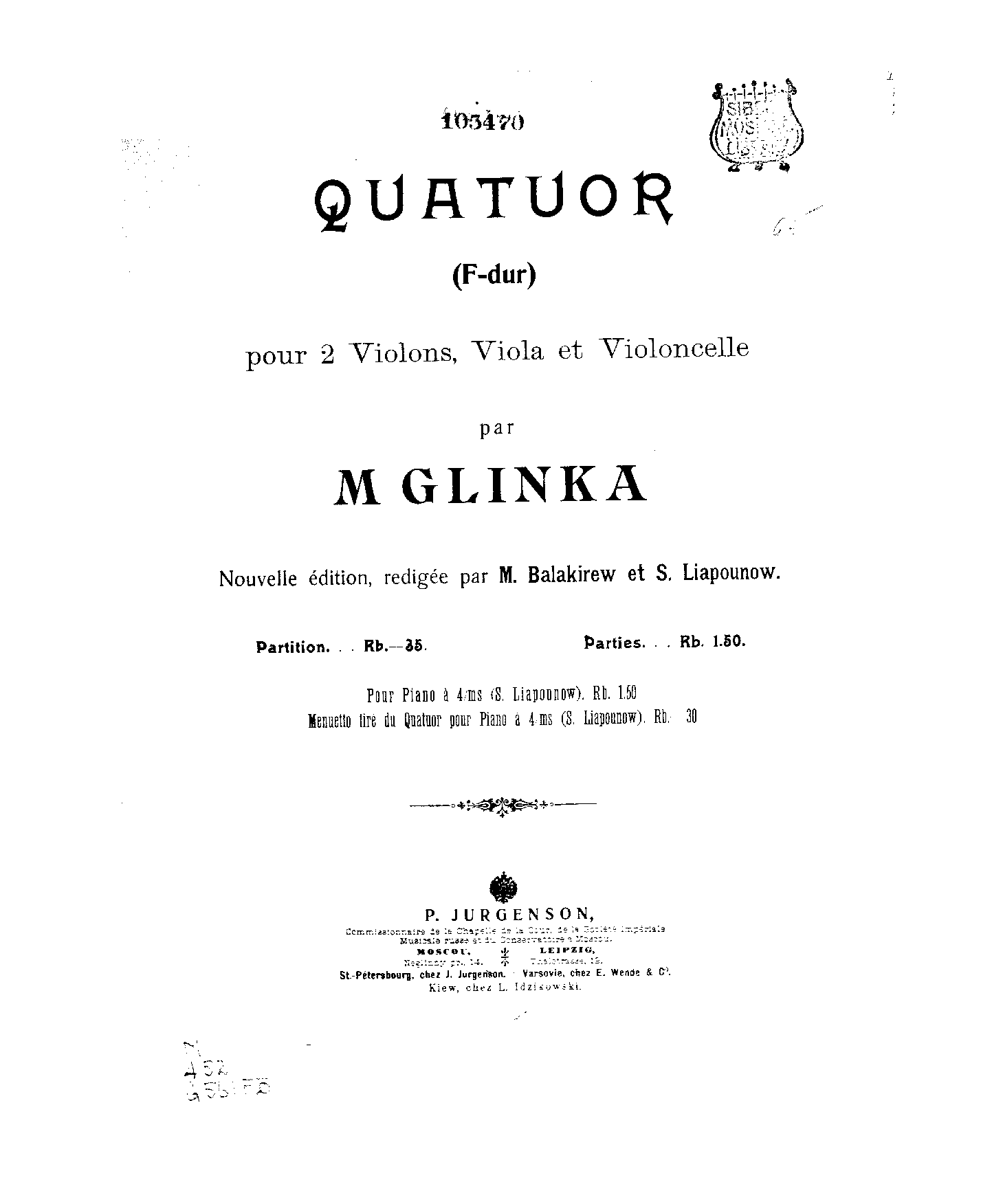 | Genre Categories | Quartets; For 2 violins, viola, cello; Scores featuring the violin; |