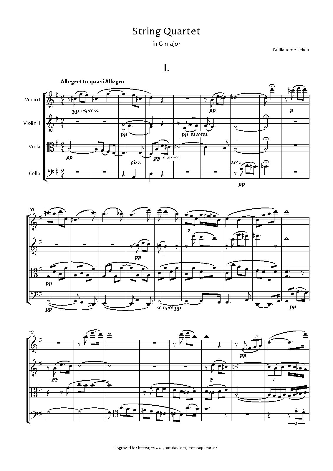 This is not a scientific critical edition, it's just an engraving made for study purpose. The main source used is the parts available on IMSLP (Copenhagen: S. Schwarz, 2005. London: Merton Music, No.4802). Minor ubiquitous incoherences bewteen parts (in dynamics and slurs, for example) have been retained. No major correction have been needed. The only issuue emerged in mv.VI, mm.194-205, where different time measures are superimposed (not clearly in parts), and in mm.206-217, where Vln.II and Cello are tacent, in spite of previous statement of the same theme (and here restored also according with the recording by Quatuor Debussy)