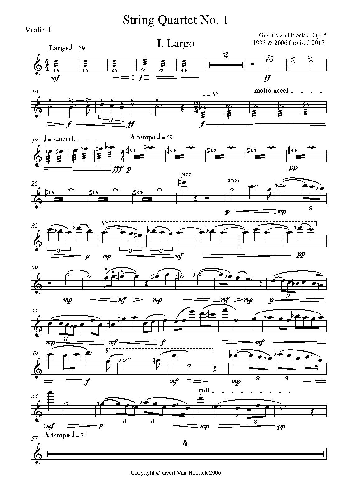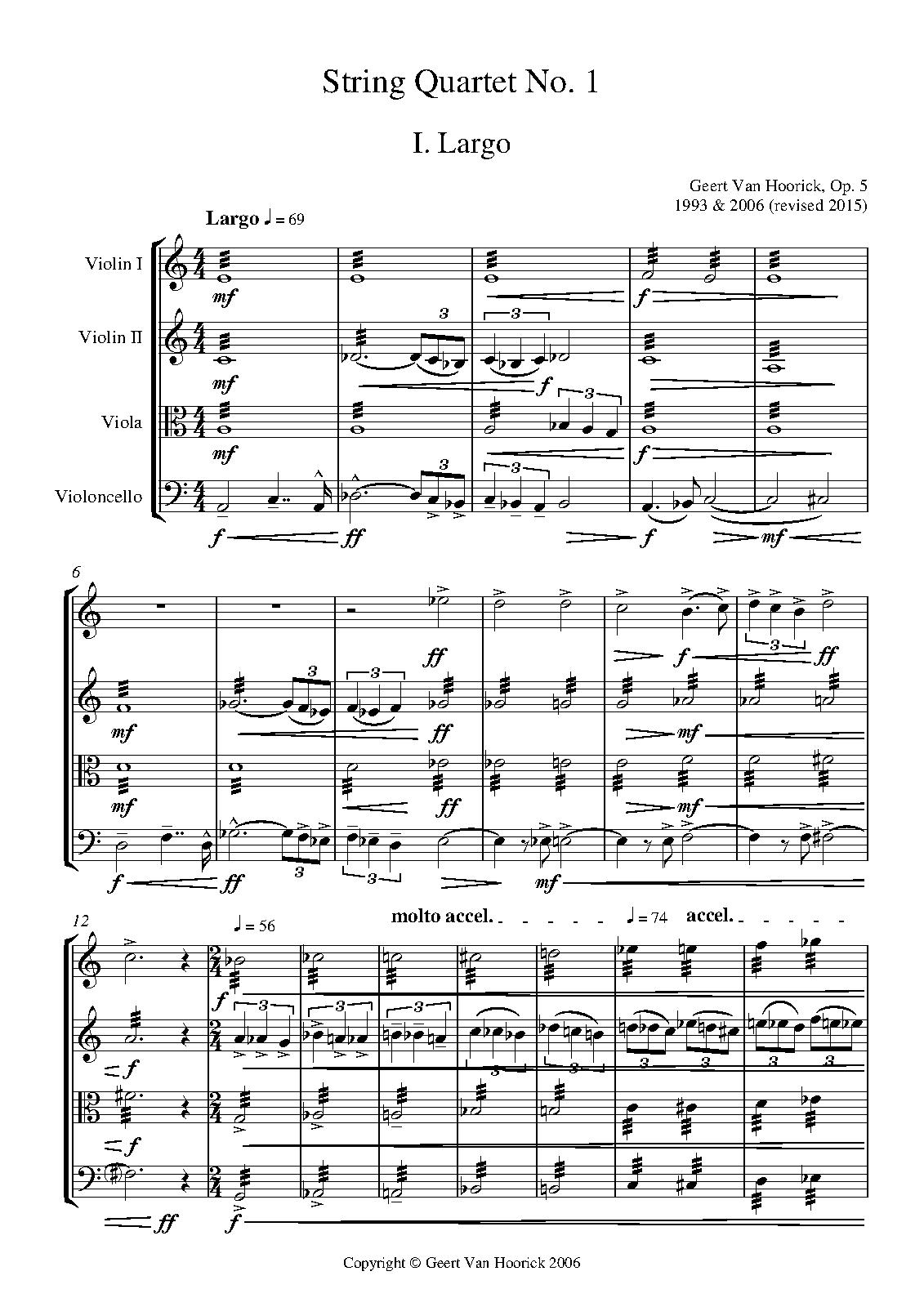This is a modern-classical string quartet, that consists of two movements. First comes a large dramatic slow movement, with two themes that are further developed (development section starting at 3’00")(no real sonata form). The 2nd movement contains an introduction and a moderately vivid section, with two themes that are further developed (also no real sonata form), and does not really solve the tension built up in the 1st movement. Digital performance made in Sibelius 6 with Garritan Personal Orchestra. Score moving videos on my YouTube-channel.