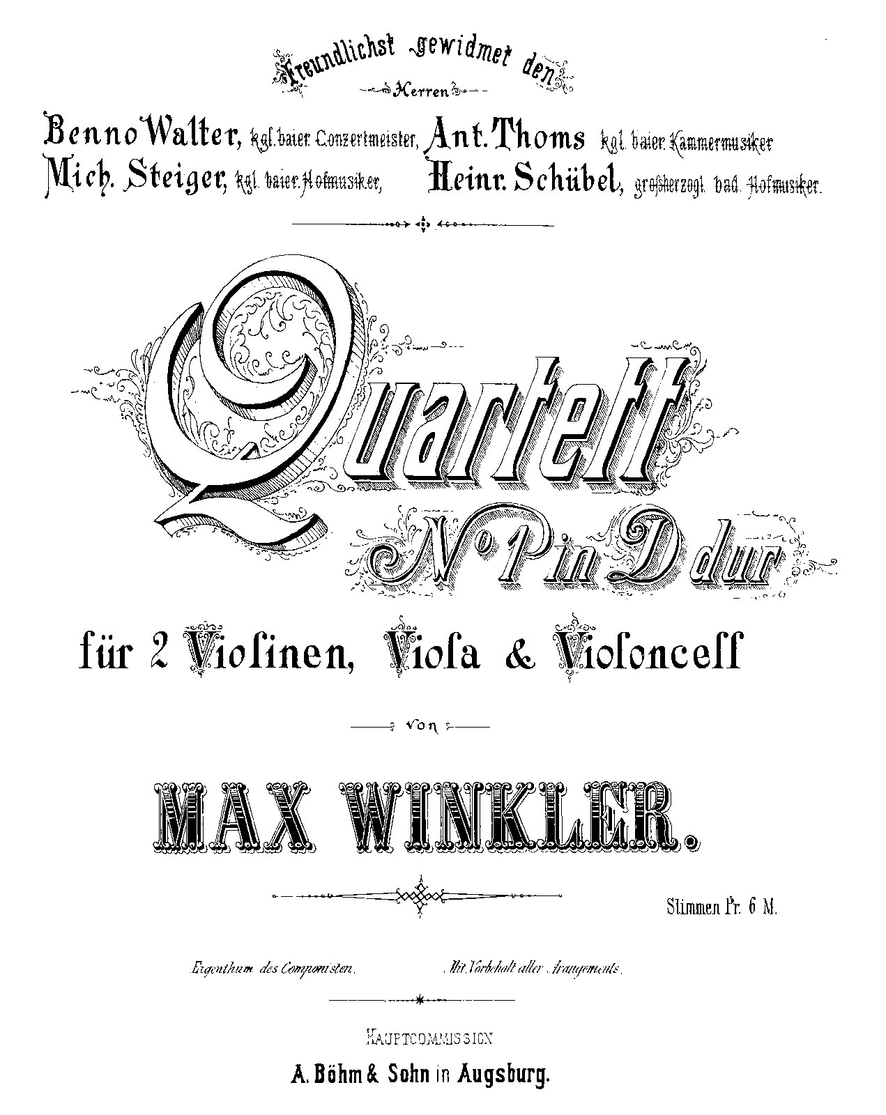 Freundlichst gewidmet dan Herren Benno Walter, kgl. baier. Conzertmeister, Ant[on] Thoms, kgl. baier. Kammermusiker, Mich[ael] Steiger, kgl. baier. Hofmusiker, Heinr. Schübel, grossherzogl. bad. Hofmusiker