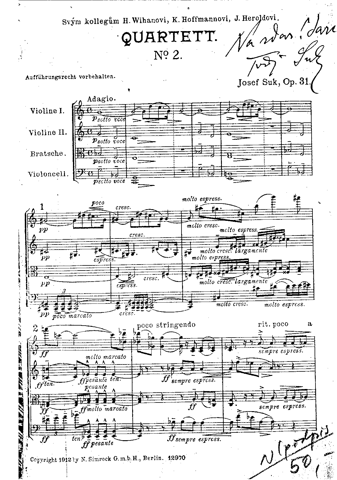"my colleagues" Karel Hoffmann, Jiří Herold, Hanuš Wihan (members of The Bohemian Quartet, along with the composer)