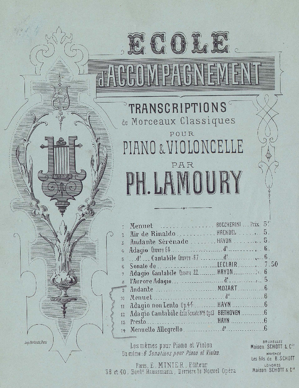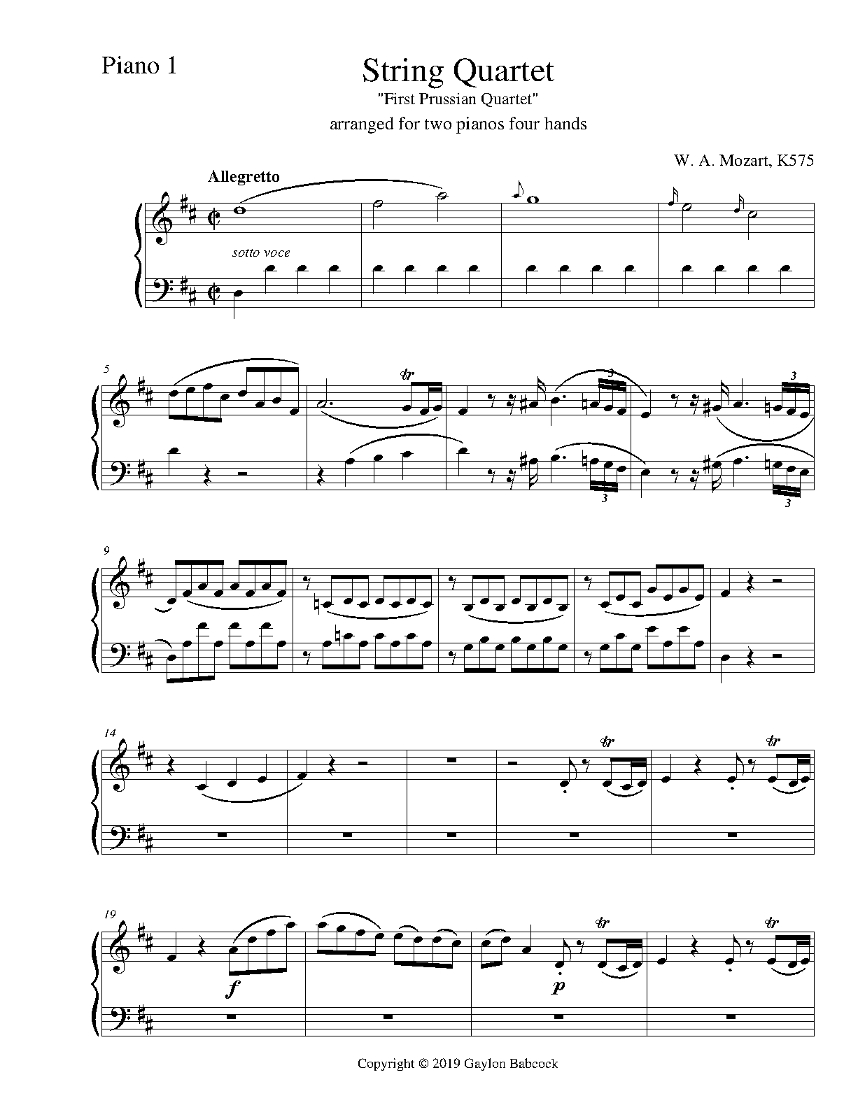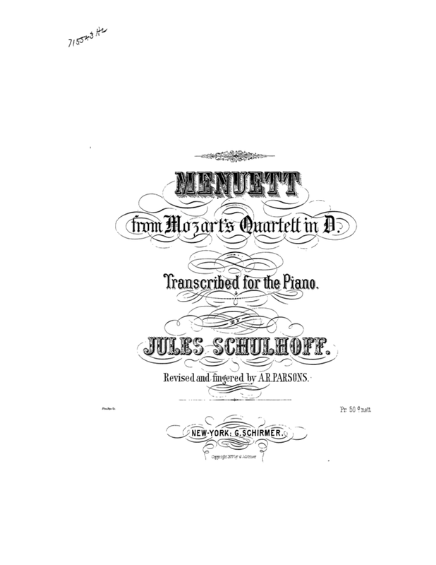 Misc. Notes "Menuett from Mozart’s Quartett in D, transcribed for the piano" by Schulhoff, edited and revised by Parsons.