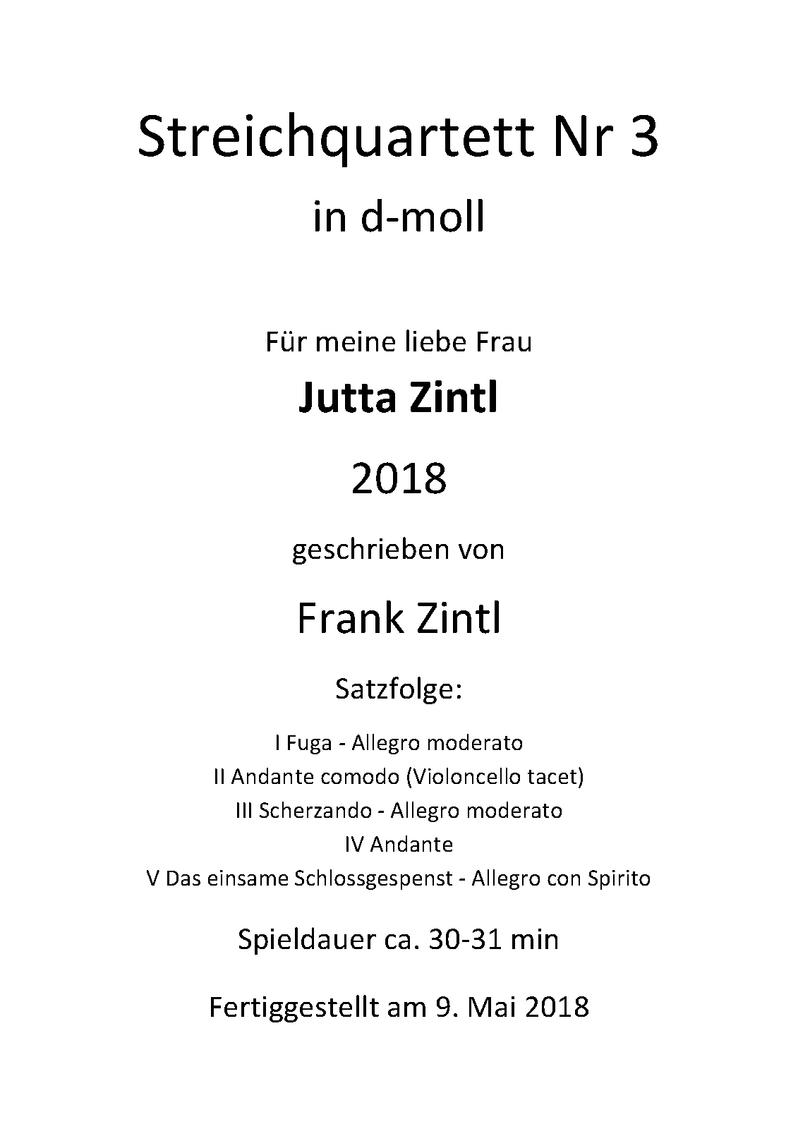 This work was completed on 9 May 2018. The last movement is based on a little song which I tried to write as early as 1975. The lyrics were by a former friend of mine and comprised a little story about a Castle Ghost like the famous Canterville Ghost. My former friend was discontent with my melody, and thus it was never used as a song. Now I decided to use it as the last movement in this quartet. Therefore the title "Das einsame Schlossgespenst", which means The lonesome Castle Ghost. The movements are: I Fuga - Allegro moderato II Andante comodo (Violoncello tacet) III Scherzando IV Andante V Das einsame Schlossgespenst.