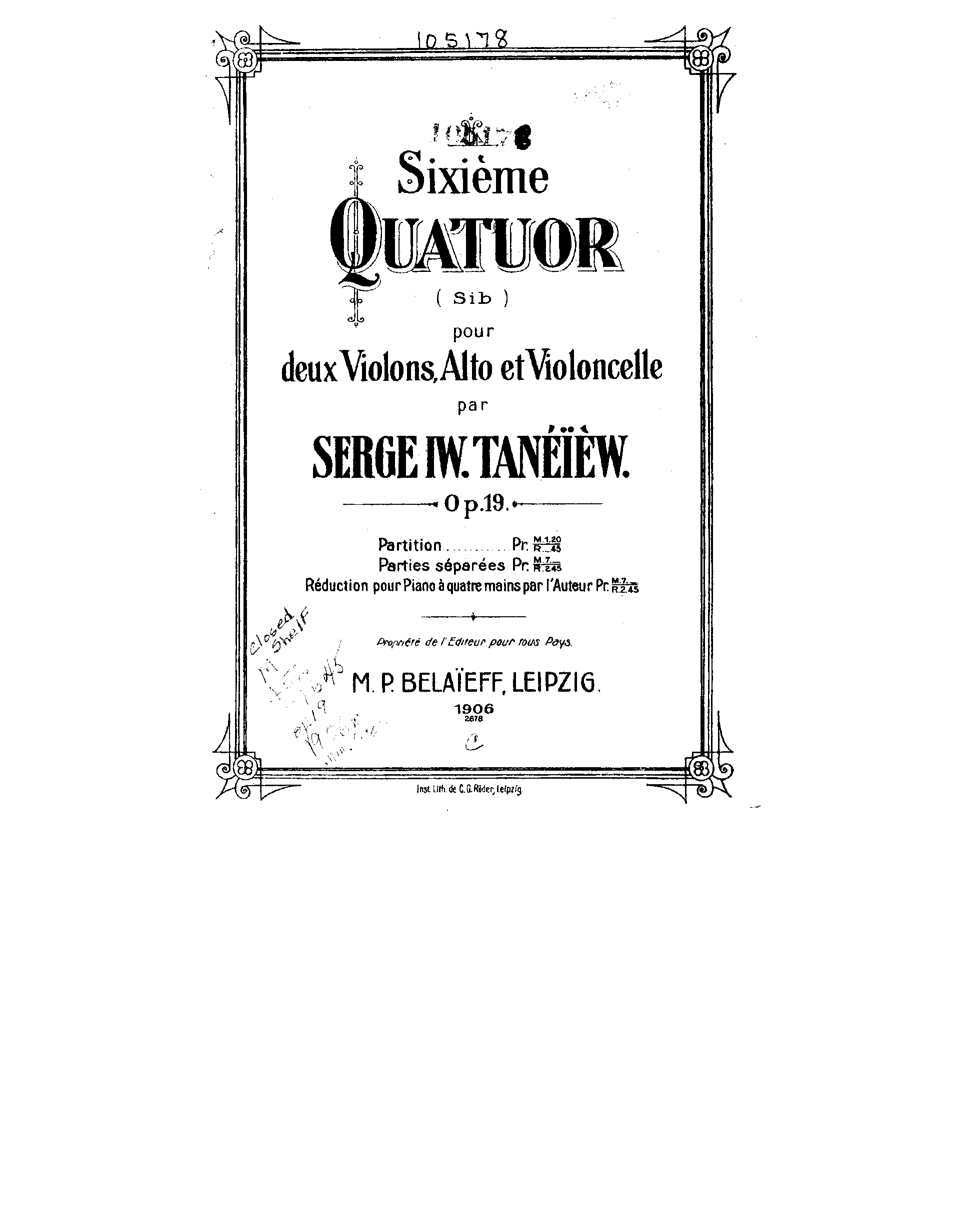 | First Publication. | 1906 – Leipzig: M.P. Belaieff. Full score. Plate 2678. 1906 – Leipzig: M.P. Belaieff. 4 parts. Plate 2679. |