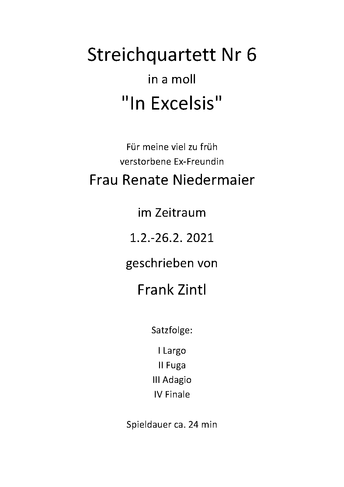 The work comprises 4 movements of different characters. Since the setting of all parts is very high, all parts are notated in the treble clef. For the same reason, it is allowed to perform the work with other instrumentation than standard string quartet. It is allowed to replace the viola (alto) by an additional violin III. It is also allowed to replace the violoncello by either a viola (Alto) or an additional violin IV. The last movement is written in the early minimalistic style of Steve Reich. It is allowed to omit the repetitions of the sections and perform the movement as a short version to bring down its length to half the time. The time for performance will then go down to about 20 minutes from 24. The work may be used freely for study, performance and recording.