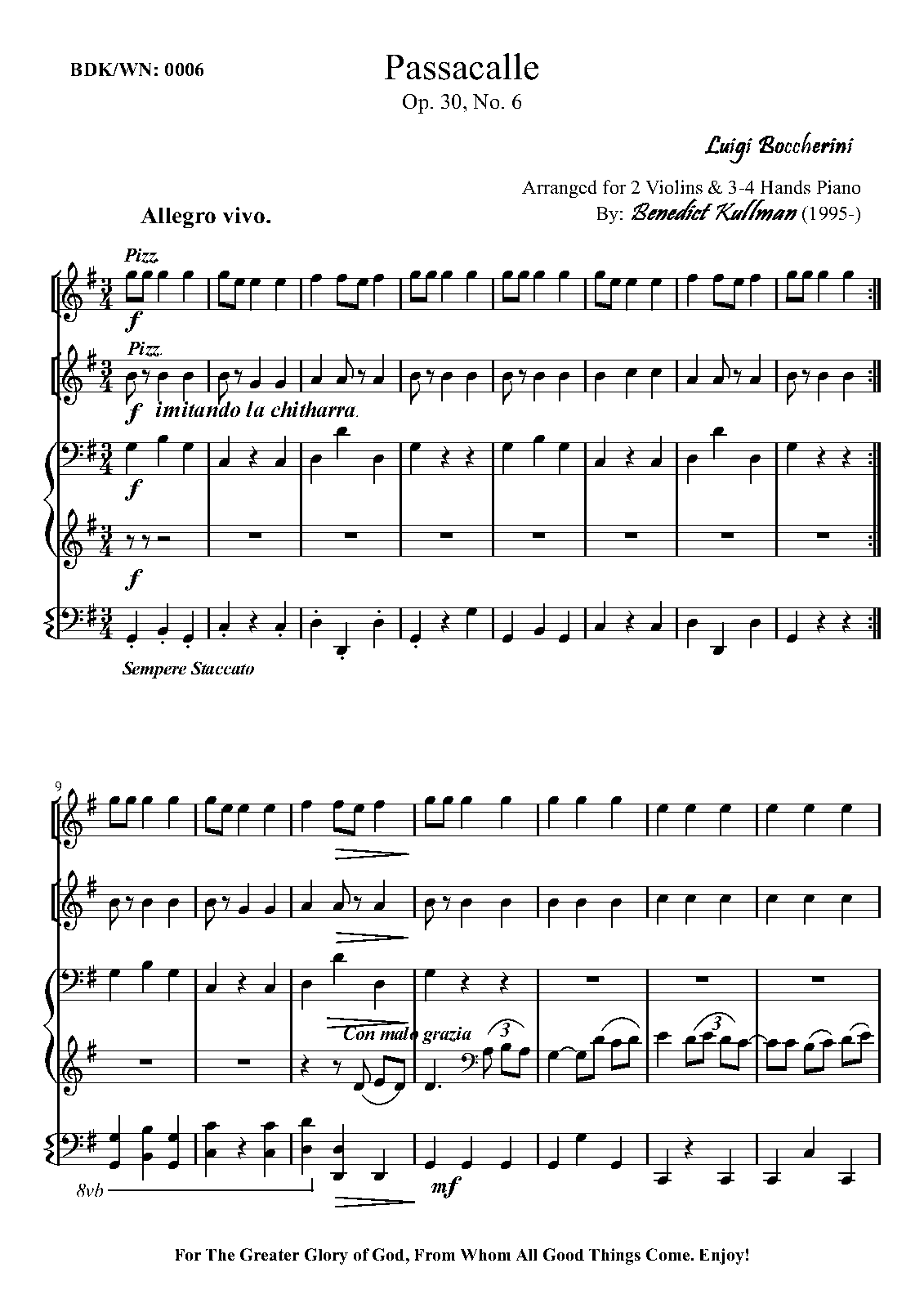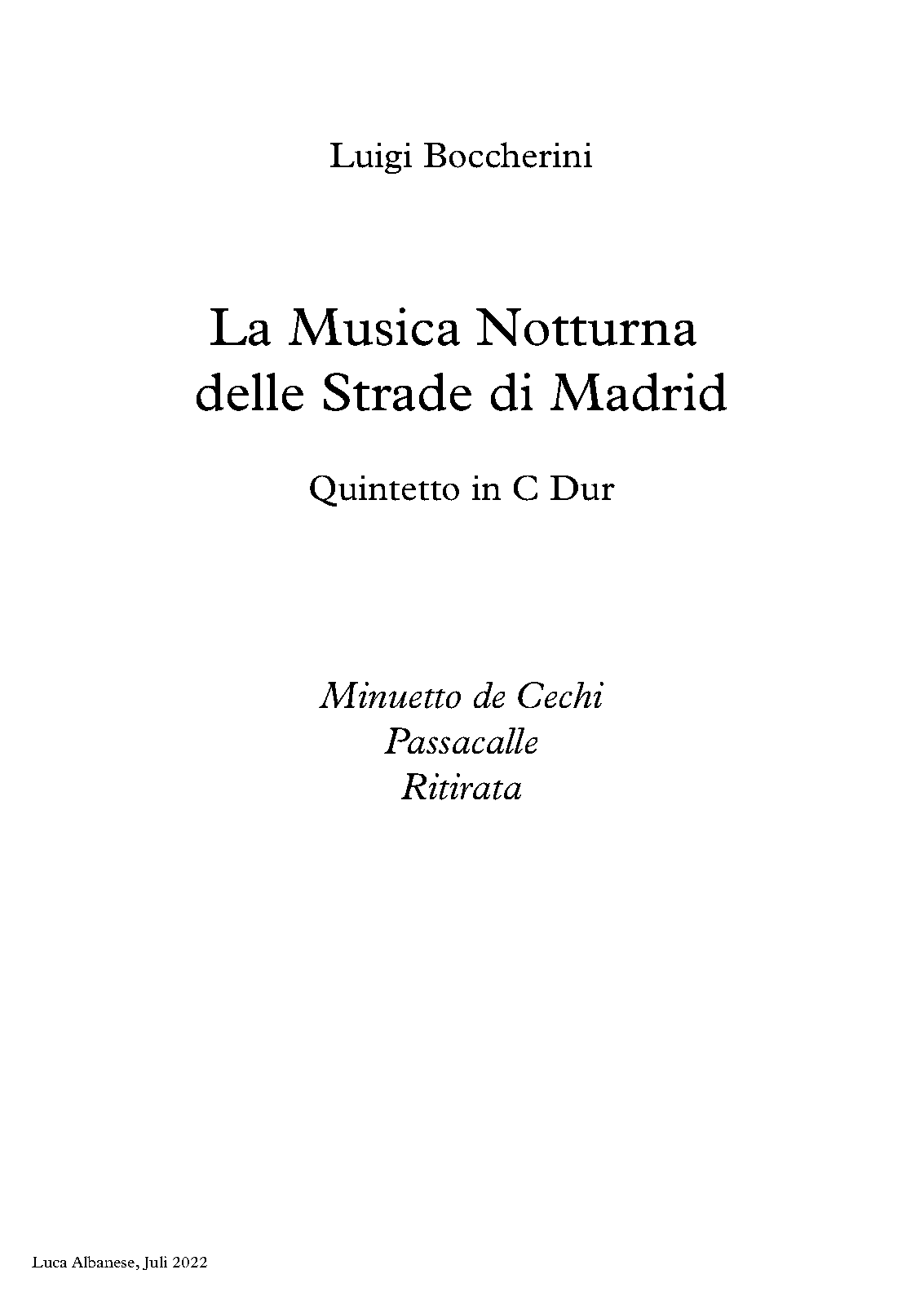 New edition using the Version by Vieweg, cross referencing with the second edition. Some technical indications by Boccherini were ommitted, as they can't be translated or give little information ("Con mala grazia", Squajalamente" etc.). Errors corrected without notice.