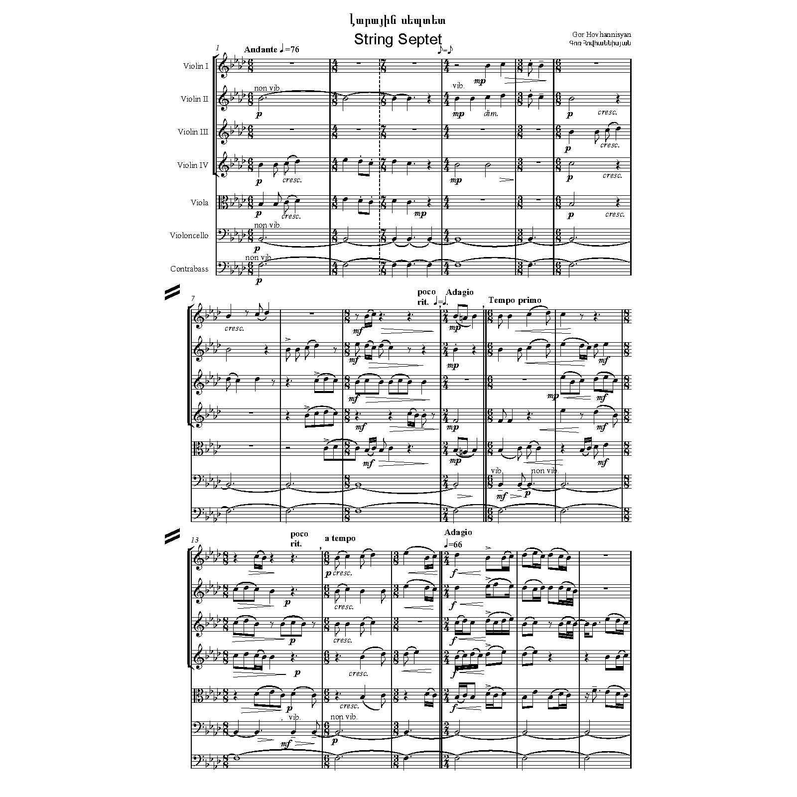 | Genre Categories | Septets; For 4 violins, viola, cello, double bass; Scores featuring the violin; |
