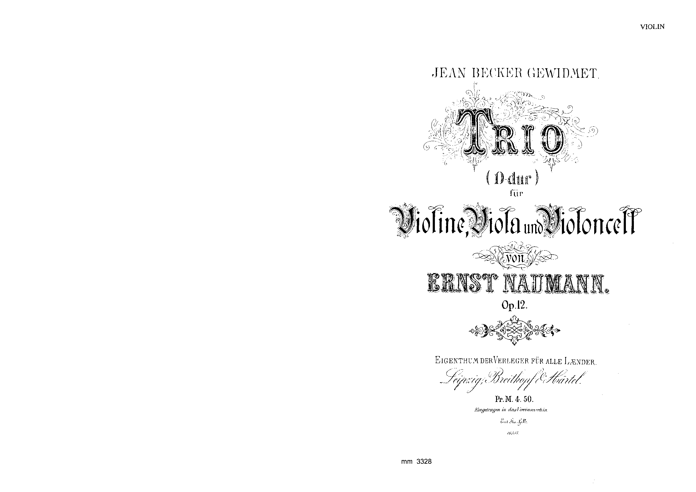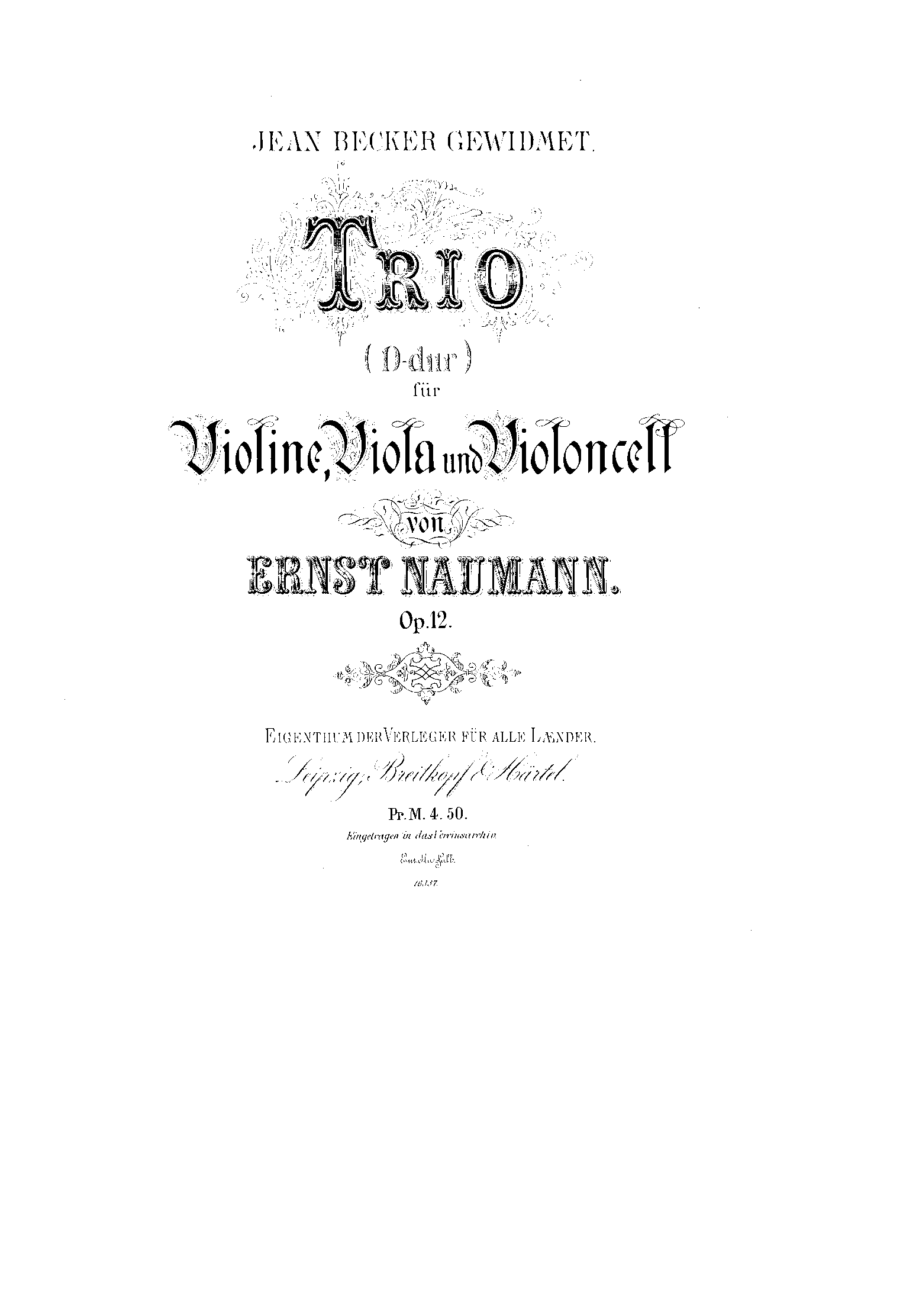 | Extra Information | Republished by Amadeus-Verlag in 1996. It seems that this publication may claim to be the first publication, ignoring the B&H?? (see review of the Naumann/Berger recording on Querstand here.) Musikalisches Wochenblatt (found using Google Books) in 1886 mentions a string trio in D "op.11" (typo? different work?) by Naumann given a performance, so first performance probably by 1886. Recorded on Querstand in 2010 and on Dreyer Gaido in 2015. |