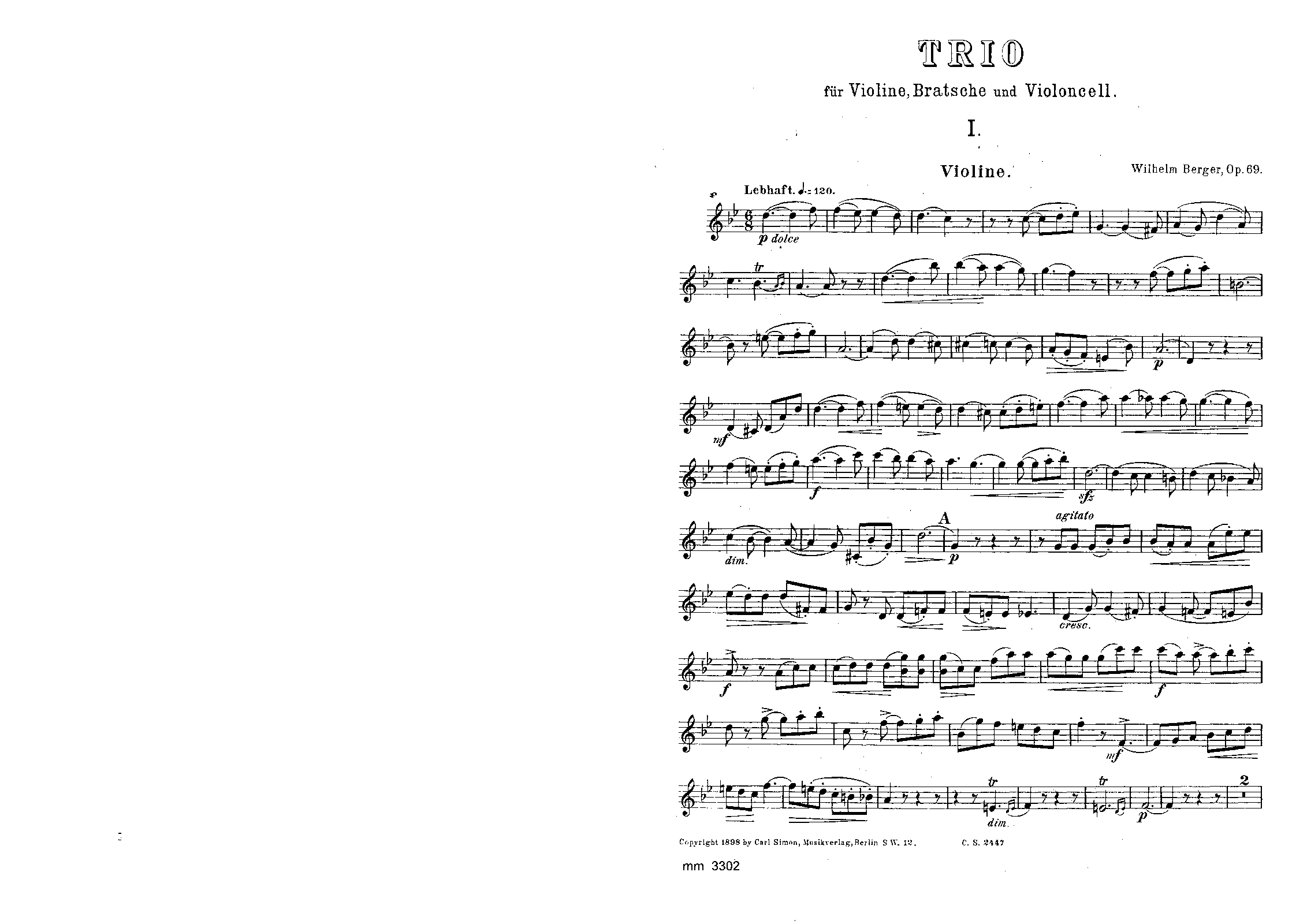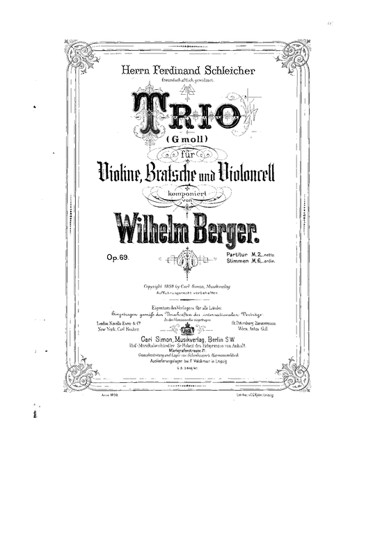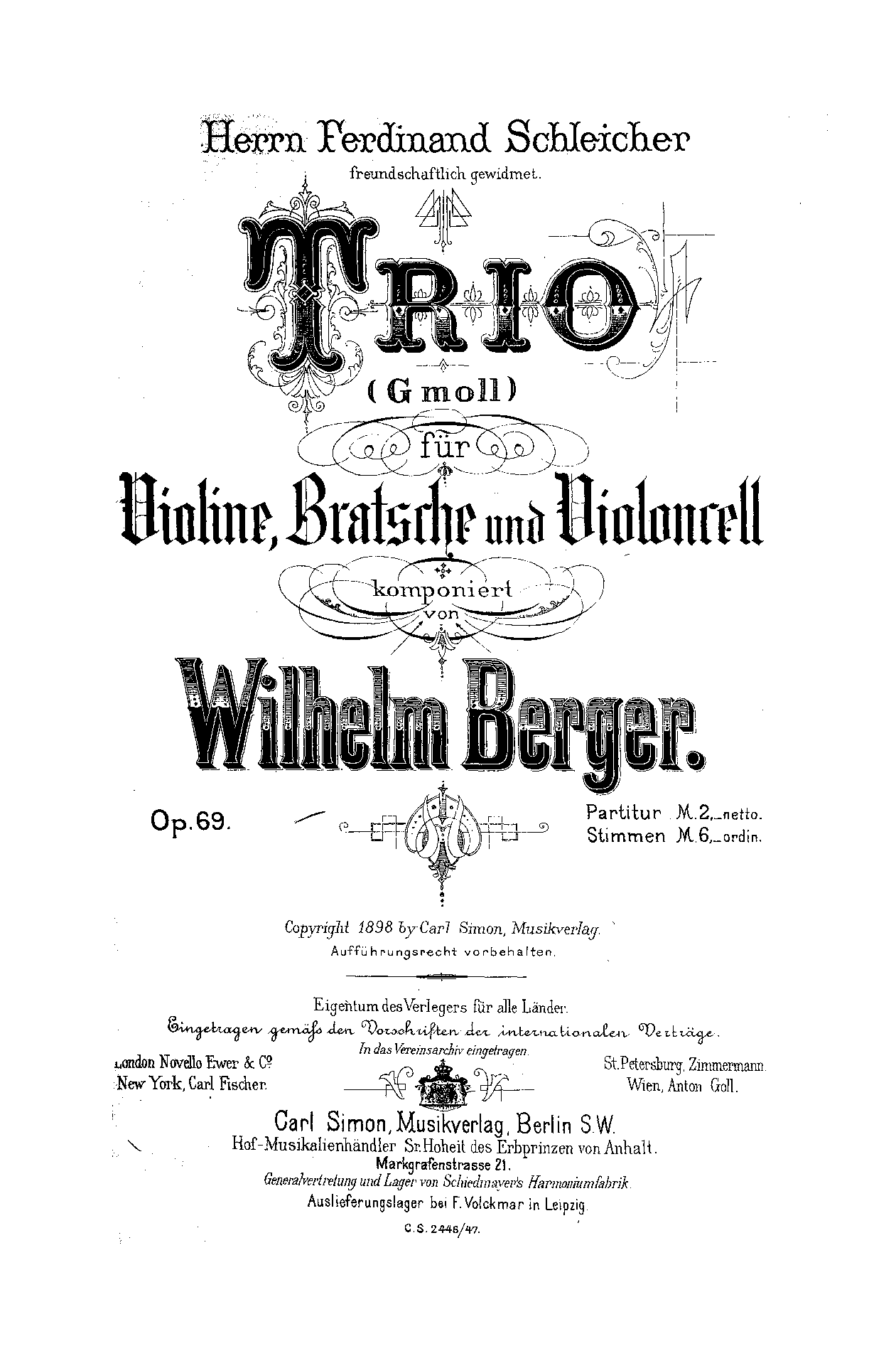 Trio, G moll, für Violine, Bratsche und Violoncell, Op. 69, komponiert von Wilhelm Berger.
