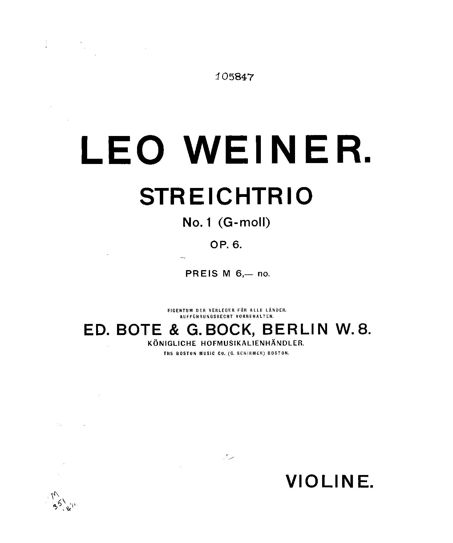 (Naxos lists a brief string trio on Hungaroton as but that's Laszlo Weiner's string trio/serenade, not Leo Weiner's G minor string trio. However Hungaroton does have a recording of Leó Weiner's string trio coupled with Dohnányi's serenade. The Andantino 3rd movement (in E major, with several internal sections whose repeat indications might be observed or ignored by performers) is 4 minutes longer in the Hungaroton performance.)