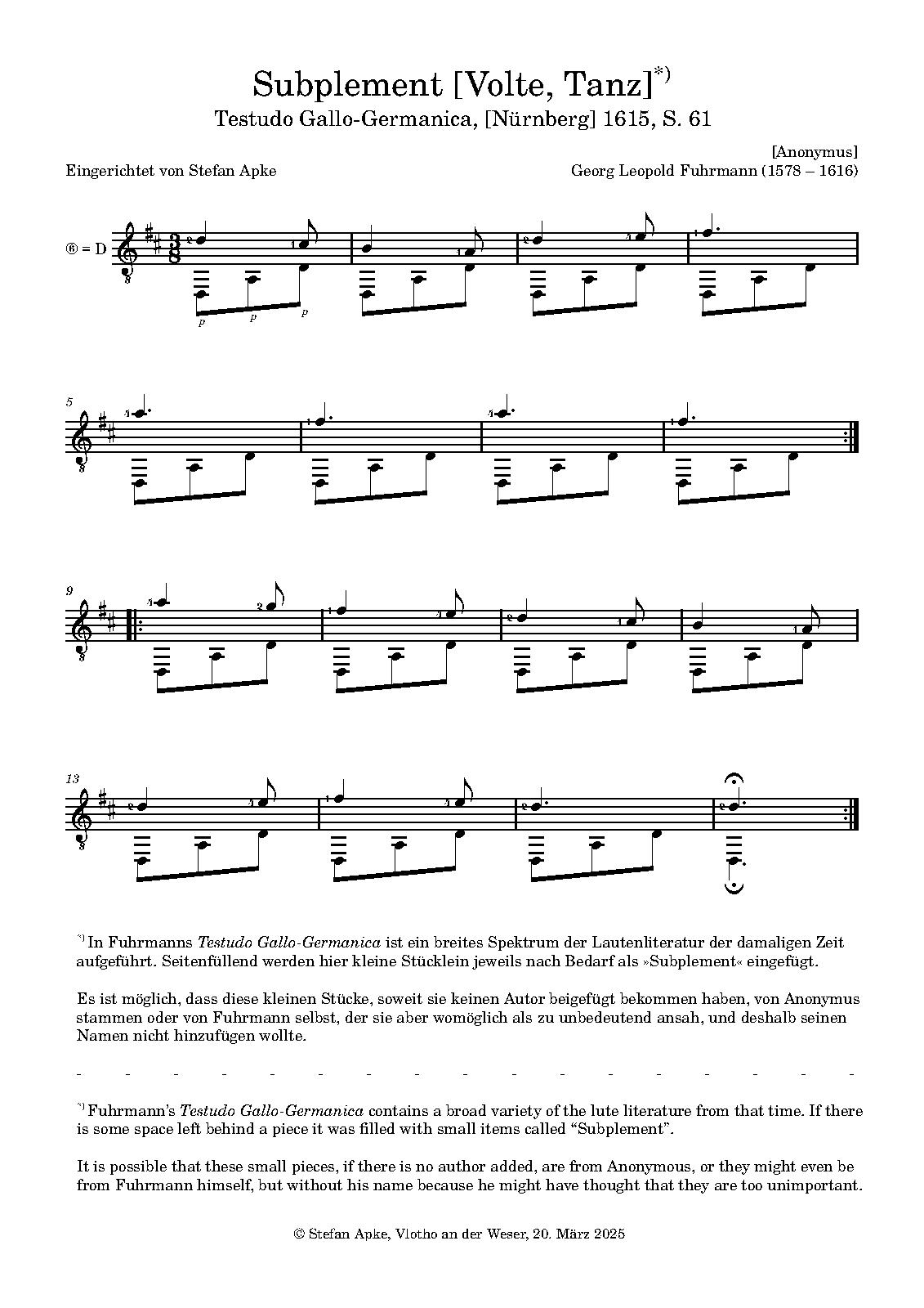 | Extra Information | This small item, a page filler called Subplement, might be from Anonymous or even from Fuhrmann himself, but without mentioning his name. (The Testudo Gallo-Germanica contained a broad variety of lute literature of that time, with real big names like John Dowland and others.) |