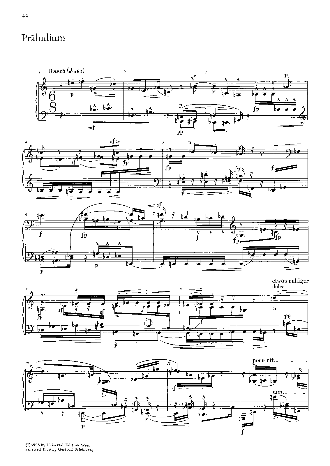 | Extra Information | Præludium composed in 1921; Intermezzo composed 1921/23; the rest composed in 1923. Early hand copies of the Universal Edition FE are visible at the work's source list at Schoenberg Center. |