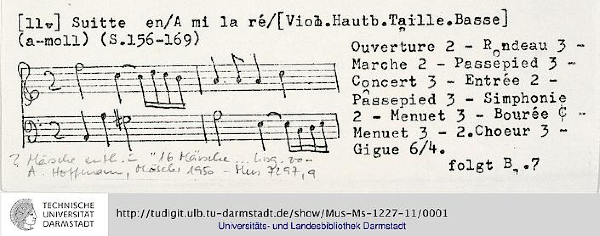 The score contains many indications that certain passages are to be played by 'haub' / 'haubois' and 'viol'. Flutes may have also been intended, as with the other Suites in this colllection.