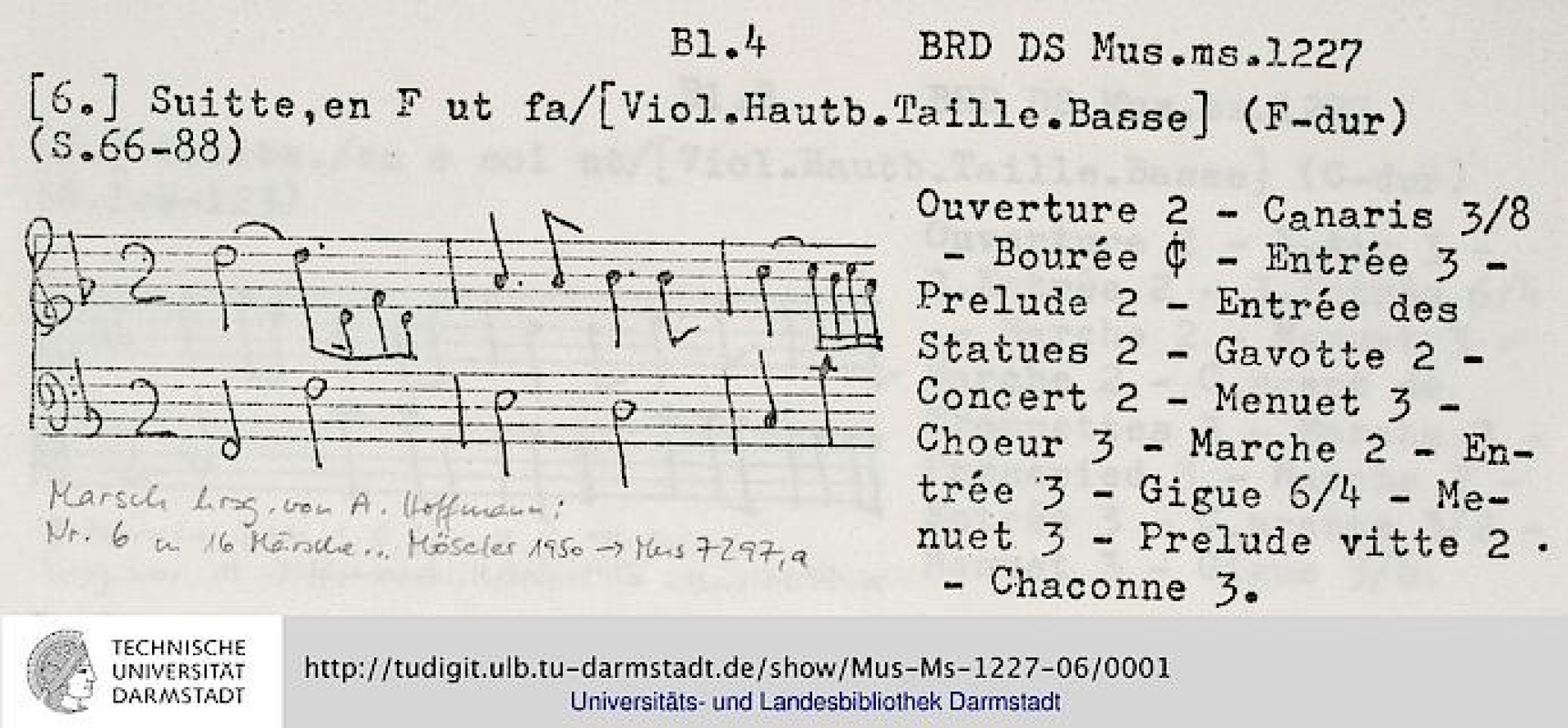 The score contains many indications that certain passages are to be played by 'haubois' and 'viol'. Flutes may have also been intended, as with the other Suites in this collection.