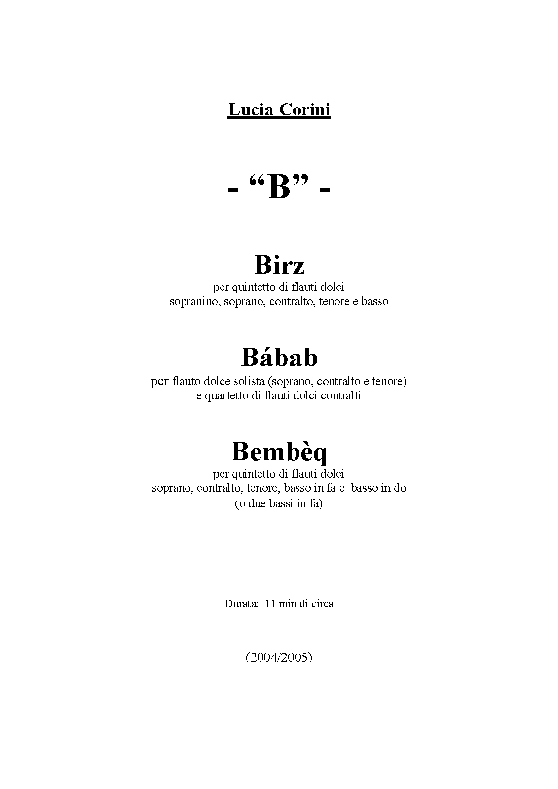 | Extra Information | This suite "B" is composed of 3 pieces: the first one, Birz, requires a sopranino, a soprano, an alto, a tenor and a bass (F) recorder; the second, Bábab, is written for a solo recorder (playing soprano, alto and tenor recorder) and 4 alto recorders; the last, Bembèq, is for soprano, alto, tenor, bass in F and bass in C or 2 basses in F. |